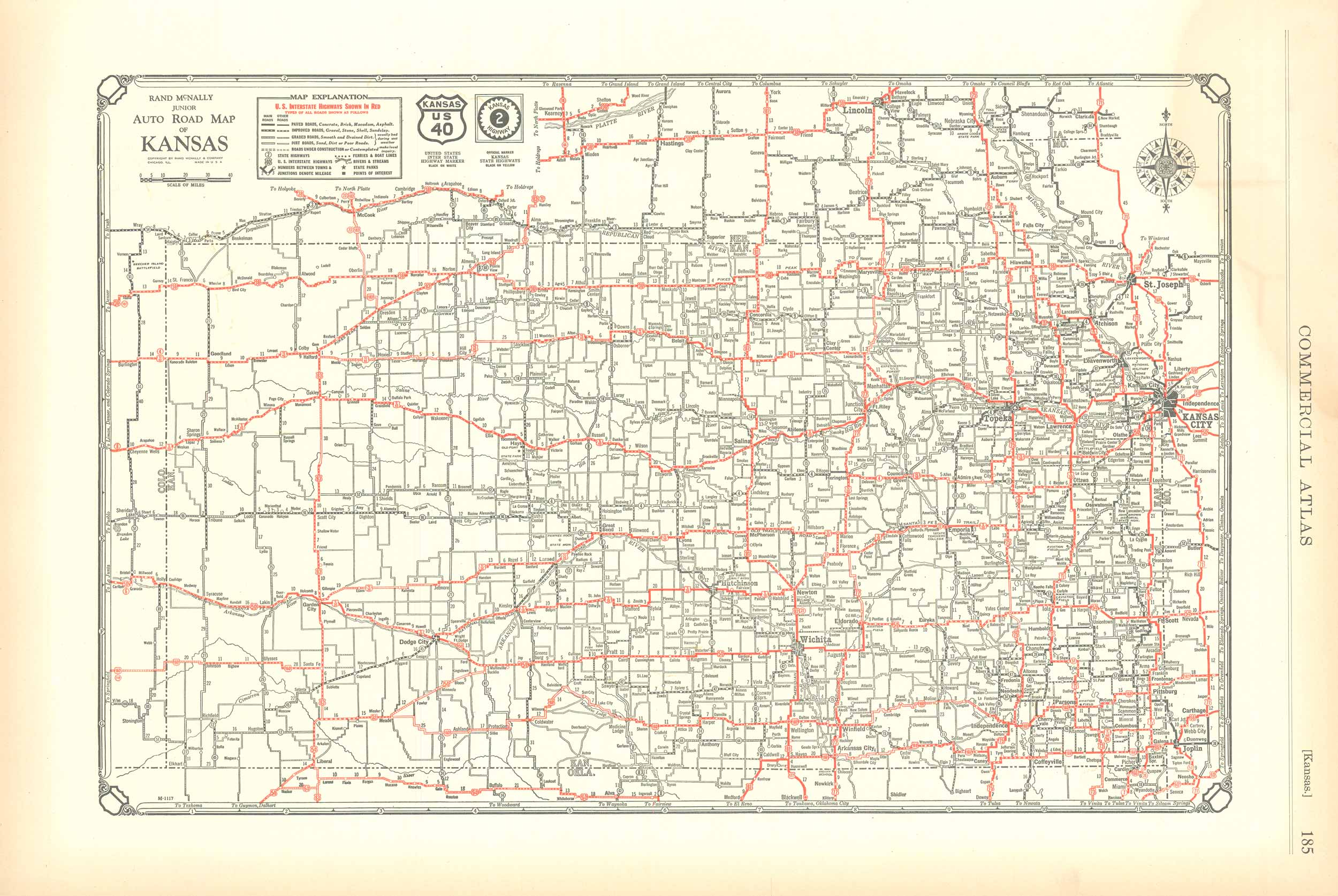 Rand McNally & Company, still a major name in map publishing to this day, began as a small print shop opened in Chicago in 1856 by William H. Rand. The shop originally printed guidebooks and directories. In 1858, Rand hired Andrew McNally who was later to become a partner. Within the next few years, the shop got into the railroad business by starting to print railway tickets and schedules, a key step in the development of the company. The ticket printing led to the publishing of railway guides, and by 1872 Rand McNally and Company had the capacity to publish maps. This map of Kansas came from Rand McNally’s Commercial Atlas. A highly successful run of atlases that lasted over a decade. These maps were primarily used by business, because of their accurate listing of railroads in operation as well as tables of statistical information. This map is unique in several ways, their large format makes an impressive display, and offers additional room where many small towns and extra details are included. Additionally a list of every railroad operating in the state in 1932 is included. All railroad routes are shown on the map. This map includes all cities and towns, lakes, rivers, and bodies of water. All topographical features are also included as well as political features such as counties and Native American Indian reservations.