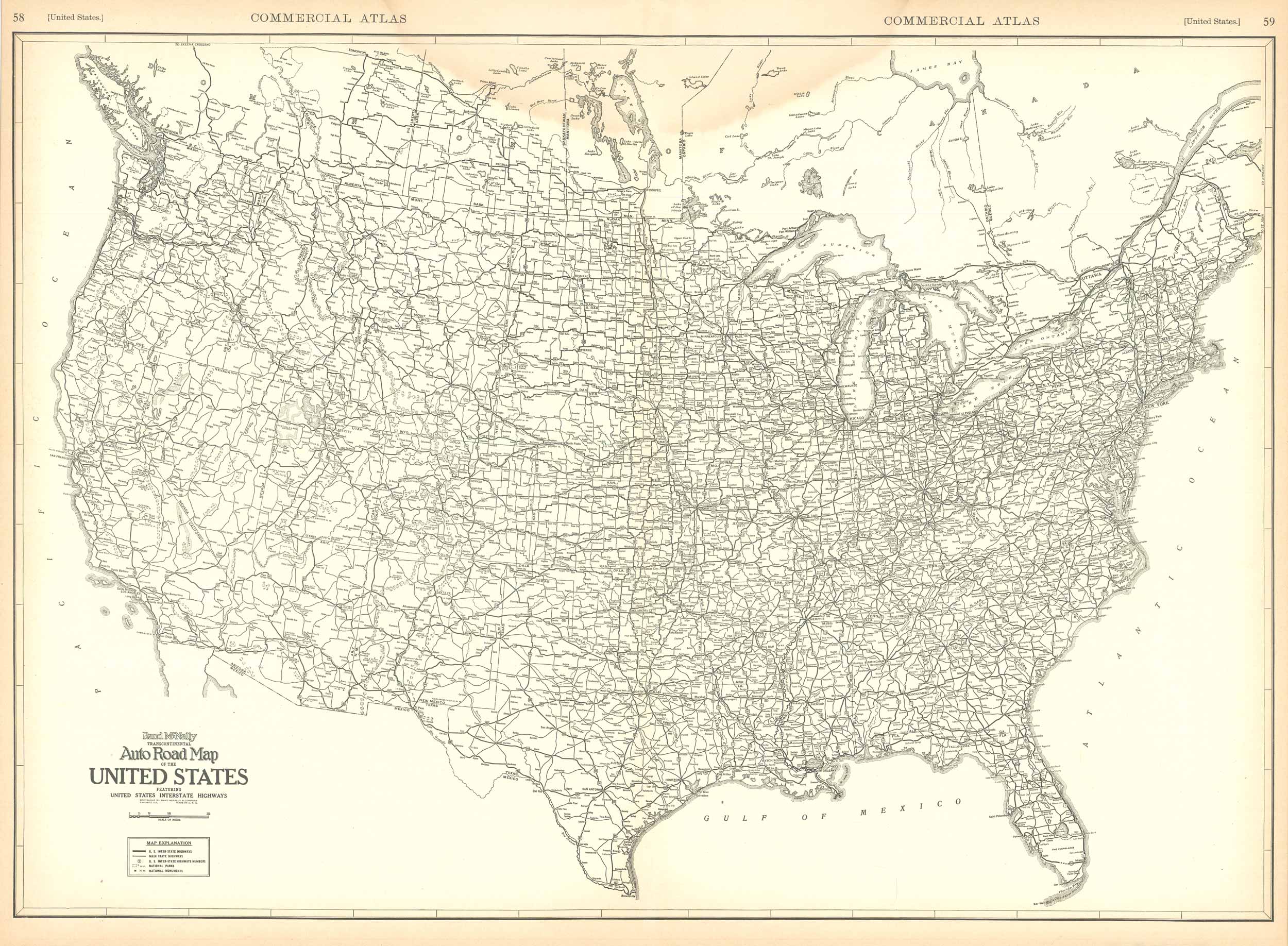 Rand McNally & Company, still a major name in map publishing to this day, began as a small print shop opened in Chicago in 1856 by William H. Rand. The shop originally printed guidebooks and directories. In 1858, Rand hired Andrew McNally who was later to become a partner. Within the next few years, the shop got into the railroad business by starting to print railway tickets and schedules, a key step in the development of the company. The ticket printing led to the publishing of railway guides, and by 1872 Rand McNally and Company had the capacity to publish maps. This road map of United States came from Rand McNally’s Commercial Atlas. A highly successful run of atlases that lasted over a decade. This map includes a detailed plan of all existing highways (in red) and all other roads in existance at the time.