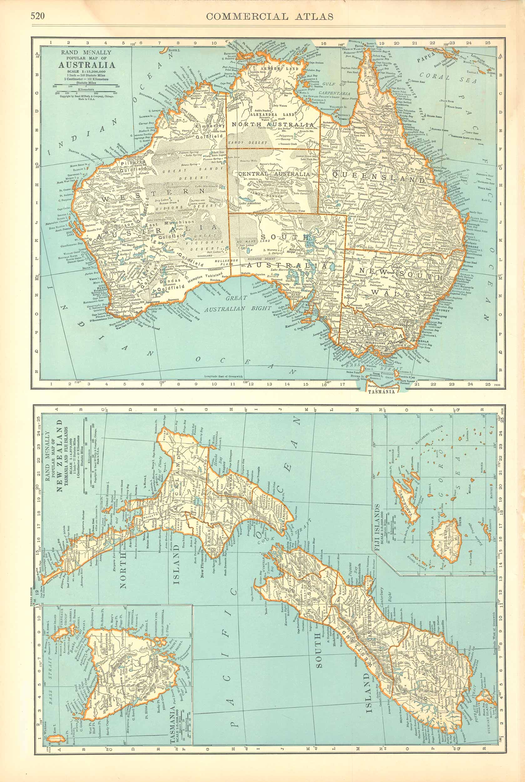 Rand McNally & Company, still a major name in map publishing to this day, began as a small print shop opened in Chicago in 1856 by William H. Rand. The shop originally printed guidebooks and directories. In 1858, Rand hired Andrew McNally who was later to become a partner. Within the next few years, the shop got into the railroad business by starting to print railway tickets and schedules, a key step in the development of the company. The ticket printing led to the publishing of railway guides, and by 1872 Rand McNally and Company had the capacity to publish maps. This map of Australia and New Zealand came from Rand McNally’s Commercial Atlas. A highly successful run of atlases that lasted over a decade. These maps were primarily used by business, because of their accurate listing of railroads in operation as well as tables of statistical information.