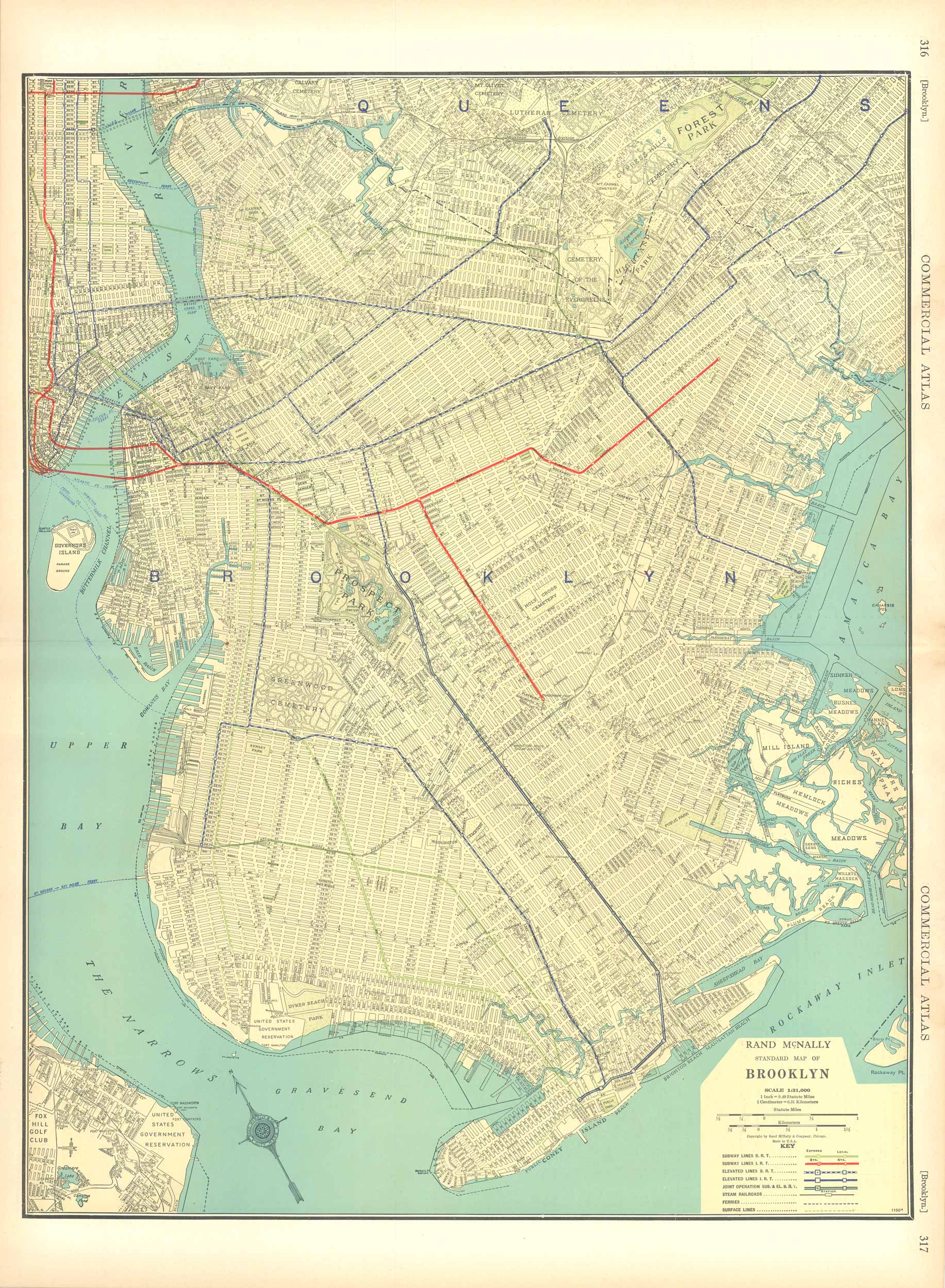 Rand McNally & Company, still a major name in map publishing to this day, began as a small print shop opened in Chicago in 1856 by William H. Rand. The shop originally printed guidebooks and directories. In 1858, Rand hired Andrew McNally who was later to become a partner. Within the next few years, the shop got into the railroad business by starting to print railway tickets and schedules, a key step in the development of the company. The ticket printing led to the publishing of railway guides, and by 1872 Rand McNally and Company had the capacity to publish maps. This map of Brooklyn came from Rand McNally’s Commercial Atlas. A highly successful run of atlases that lasted over a decade. These maps were primarily used by business, because of their accurate listing of railroads in operation as well as tables of statistical information. This map is unique in several ways, their large format makes an impressive display, and offers additional room where many small towns and extra details are included. Additionally a list of every railroad operating in the state in 1932 is included. All railroad routes are shown on the map. This map includes all cities and towns, lakes, rivers, and bodies of water. All topographical features are also included as well as political features such as counties and Native American Indian reservations.