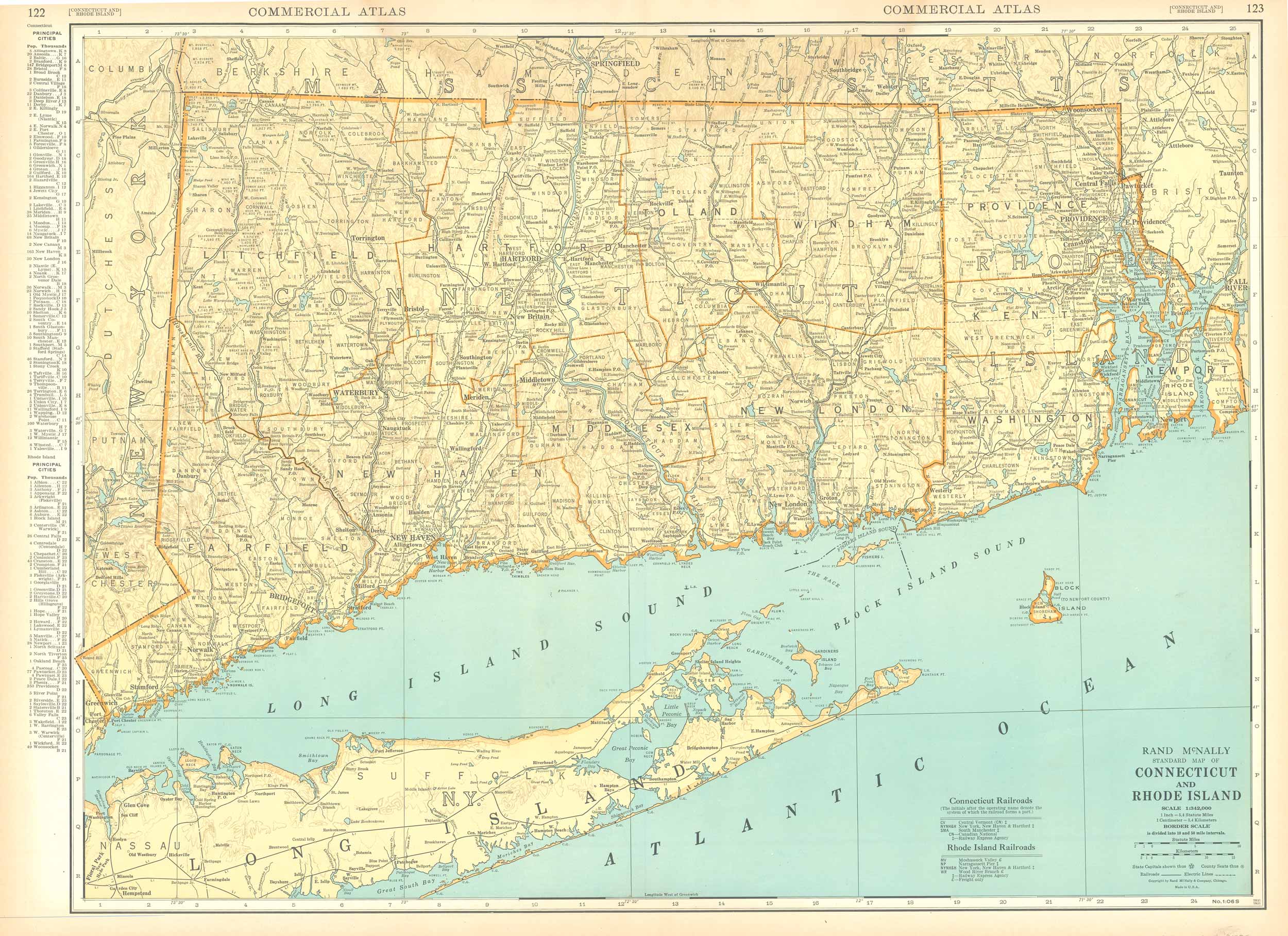 Rand McNally & Company, still a major name in map publishing to this day, began as a small print shop opened in Chicago in 1856 by William H. Rand. The shop originally printed guidebooks and directories. In 1858, Rand hired Andrew McNally who was later to become a partner. Within the next few years, the shop got into the railroad business by starting to print railway tickets and schedules, a key step in the development of the company. The ticket printing led to the publishing of railway guides, and by 1872 Rand McNally and Company had the capacity to publish maps. This map of Connecticut and Rhode Island came from Rand McNally’s Commercial Atlas. A highly successful run of atlases that lasted over a decade. These maps were primarily used by business, because of their accurate listing of railroads in operation as well as tables of statistical information.