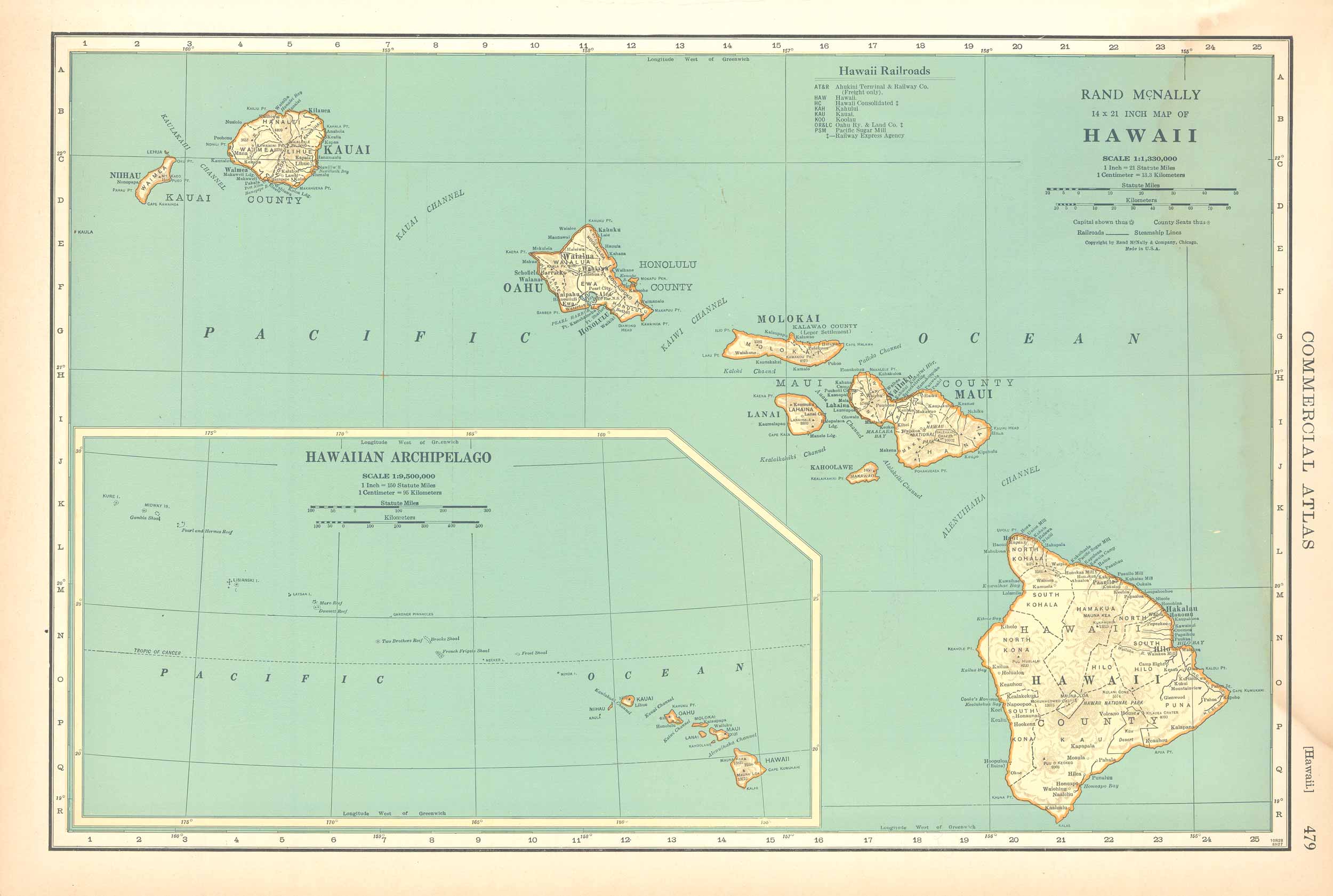 Rand McNally & Company, still a major name in map publishing to this day, began as a small print shop opened in Chicago in 1856 by William H. Rand. The shop originally printed guidebooks and directories. In 1858, Rand hired Andrew McNally who was later to become a partner. Within the next few years, the shop got into the railroad business by starting to print railway tickets and schedules, a key step in the development of the company. The ticket printing led to the publishing of railway guides, and by 1872 Rand McNally and Company had the capacity to publish maps. This map of Hawaii came from Rand McNally’s Commercial Atlas. A highly successful run of atlases that lasted over a decade. These maps were primarily used by business, because of their accurate listing of railroads in operation as well as tables of statistical information. This map is unique in several ways, their large format makes an impressive display, and offers additional room where many small towns and extra details are included. Additionally a list of every railroad operating in the state in 1932 is included. All railroad routes are shown on the map. This map includes all cities and towns, lakes, rivers, and bodies of water. All topographical features are also included as well as political features such as counties and Native American Indian reservations.