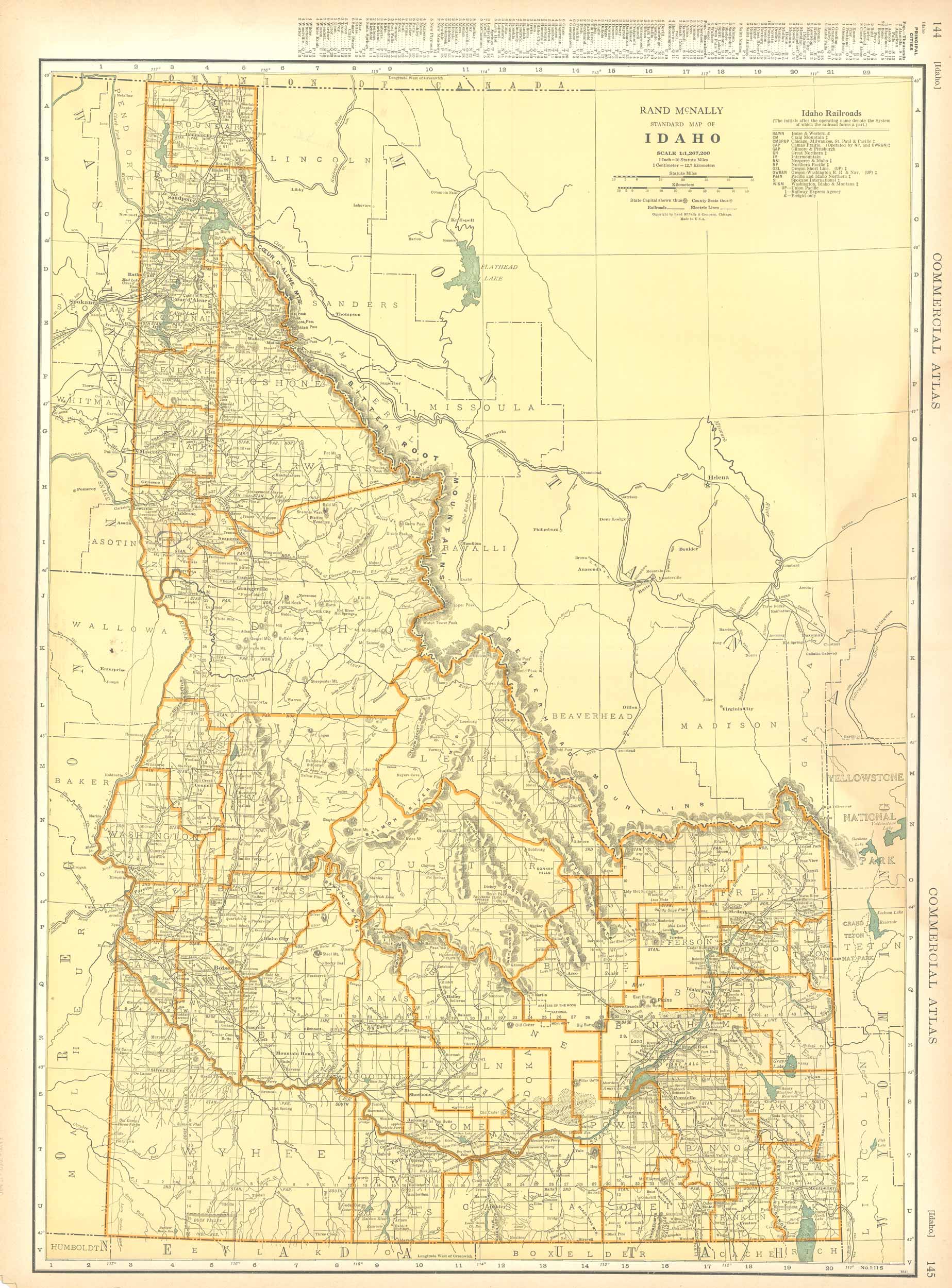 Rand McNally & Company, still a major name in map publishing to this day, began as a small print shop opened in Chicago in 1856 by William H. Rand. The shop originally printed guidebooks and directories. In 1858, Rand hired Andrew McNally who was later to become a partner. Within the next few years, the shop got into the railroad business by starting to print railway tickets and schedules, a key step in the development of the company. The ticket printing led to the publishing of railway guides, and by 1872 Rand McNally and Company had the capacity to publish maps. This map of Idaho came from Rand McNally’s Commercial Atlas. A highly successful run of atlases that lasted over a decade. These maps were primarily used by business, because of their accurate listing of railroads in operation as well as tables of statistical information. This map is unique in several ways, their large format makes an impressive display, and offers additional room where many small towns and extra details are included. Additionally a list of every railroad operating in the state in 1932 is included. All railroad routes are shown on the map. This map includes all cities and towns, lakes, rivers, and bodies of water. All topographical features are also included as well as political features such as counties and Native American Indian reservations.