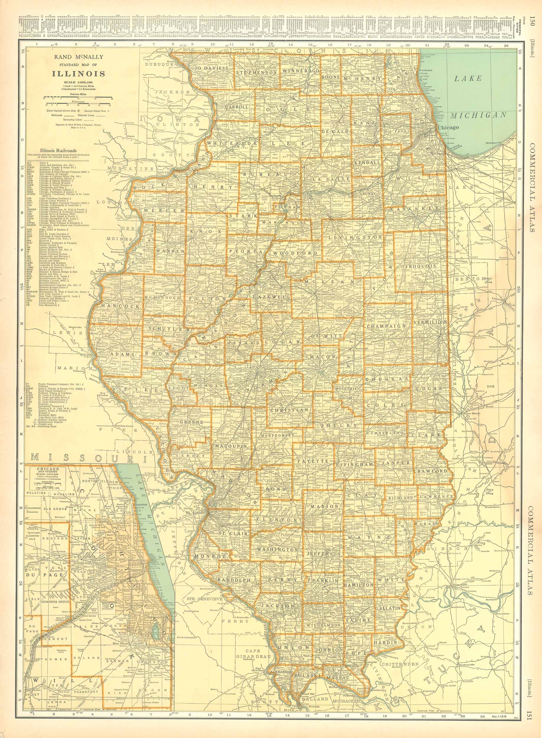 Rand McNally & Company, still a major name in map publishing to this day, began as a small print shop opened in Chicago in 1856 by William H. Rand. The shop originally printed guidebooks and directories. In 1858, Rand hired Andrew McNally who was later to become a partner. Within the next few years, the shop got into the railroad business by starting to print railway tickets and schedules, a key step in the development of the company. The ticket printing led to the publishing of railway guides, and by 1872 Rand McNally and Company had the capacity to publish maps. This map of Illinois came from Rand McNally’s Commercial Atlas. A highly successful run of atlases that lasted over a decade. These maps were primarily used by business, because of their accurate listing of railroads in operation as well as tables of statistical information. This map is unique in several ways, their large format makes an impressive display, and offers additional room where many small towns and extra details are included. Additionally a list of every railroad operating in the state in 1932 is included. All railroad routes are shown on the map. This map includes all cities and towns, lakes, rivers, and bodies of water. All topographical features are also included as well as political features such as counties and Native American Indian reservations.