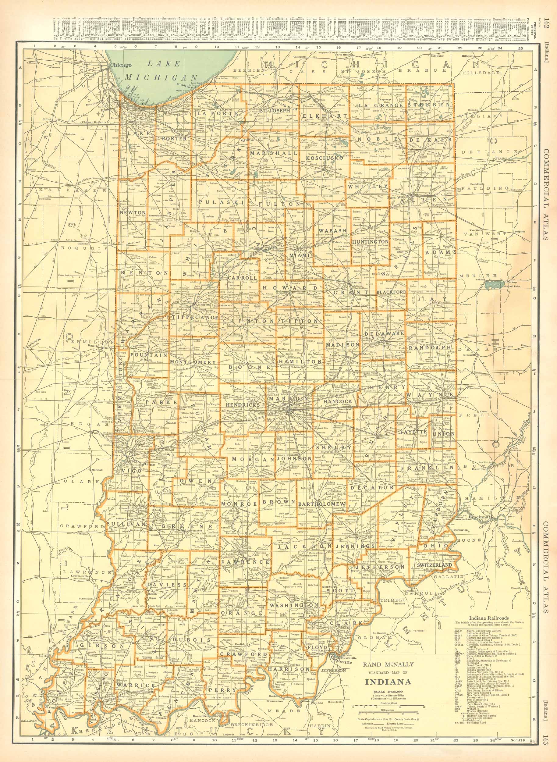Rand McNally & Company, still a major name in map publishing to this day, began as a small print shop opened in Chicago in 1856 by William H. Rand. The shop originally printed guidebooks and directories. In 1858, Rand hired Andrew McNally who was later to become a partner. Within the next few years, the shop got into the railroad business by starting to print railway tickets and schedules, a key step in the development of the company. The ticket printing led to the publishing of railway guides, and by 1872 Rand McNally and Company had the capacity to publish maps. This map of Indiana came from Rand McNally’s Commercial Atlas. A highly successful run of atlases that lasted over a decade. These maps were primarily used by business, because of their accurate listing of railroads in operation as well as tables of statistical information. This map is unique in several ways, their large format makes an impressive display, and offers additional room where many small towns and extra details are included. Additionally a list of every railroad operating in the state in 1932 is included. All railroad routes are shown on the map. This map includes all cities and towns, lakes, rivers, and bodies of water. All topographical features are also included as well as political features such as counties and Native American Indian reservations.