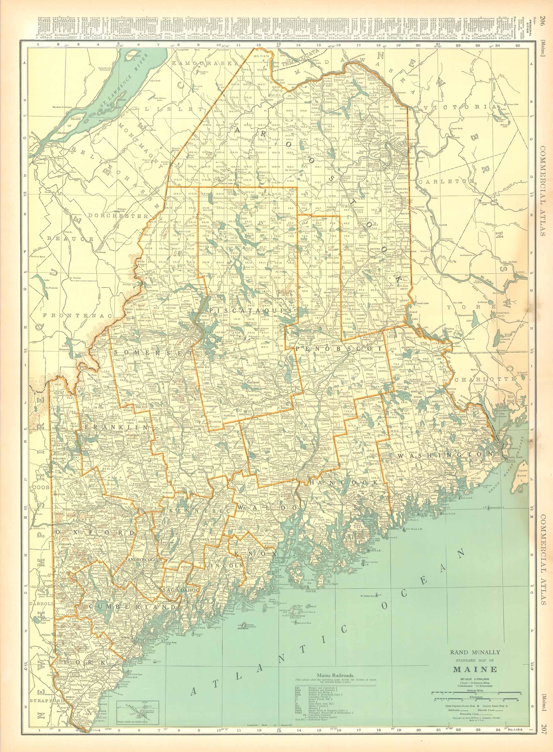 Rand McNally & Company, still a major name in map publishing to this day, began as a small print shop opened in Chicago in 1856 by William H. Rand. The shop originally printed guidebooks and directories. In 1858, Rand hired Andrew McNally who was later to become a partner. Within the next few years, the shop got into the railroad business by starting to print railway tickets and schedules, a key step in the development of the company. The ticket printing led to the publishing of railway guides, and by 1872 Rand McNally and Company had the capacity to publish maps. This map of Maine came from Rand McNally’s Commercial Atlas. A highly successful run of atlases that lasted over a decade. These maps were primarily used by business, because of their accurate listing of railroads in operation as well as tables of statistical information. This map is unique in several ways, their large format makes an impressive display, and offers additional room where many small towns and extra details are included. Additionally a list of every railroad operating in the state in 1932 is included. All railroad routes are shown on the map. This map includes all cities and towns, lakes, rivers, and bodies of water. All topographical features are also included as well as political features such as counties and Native American Indian reservations.