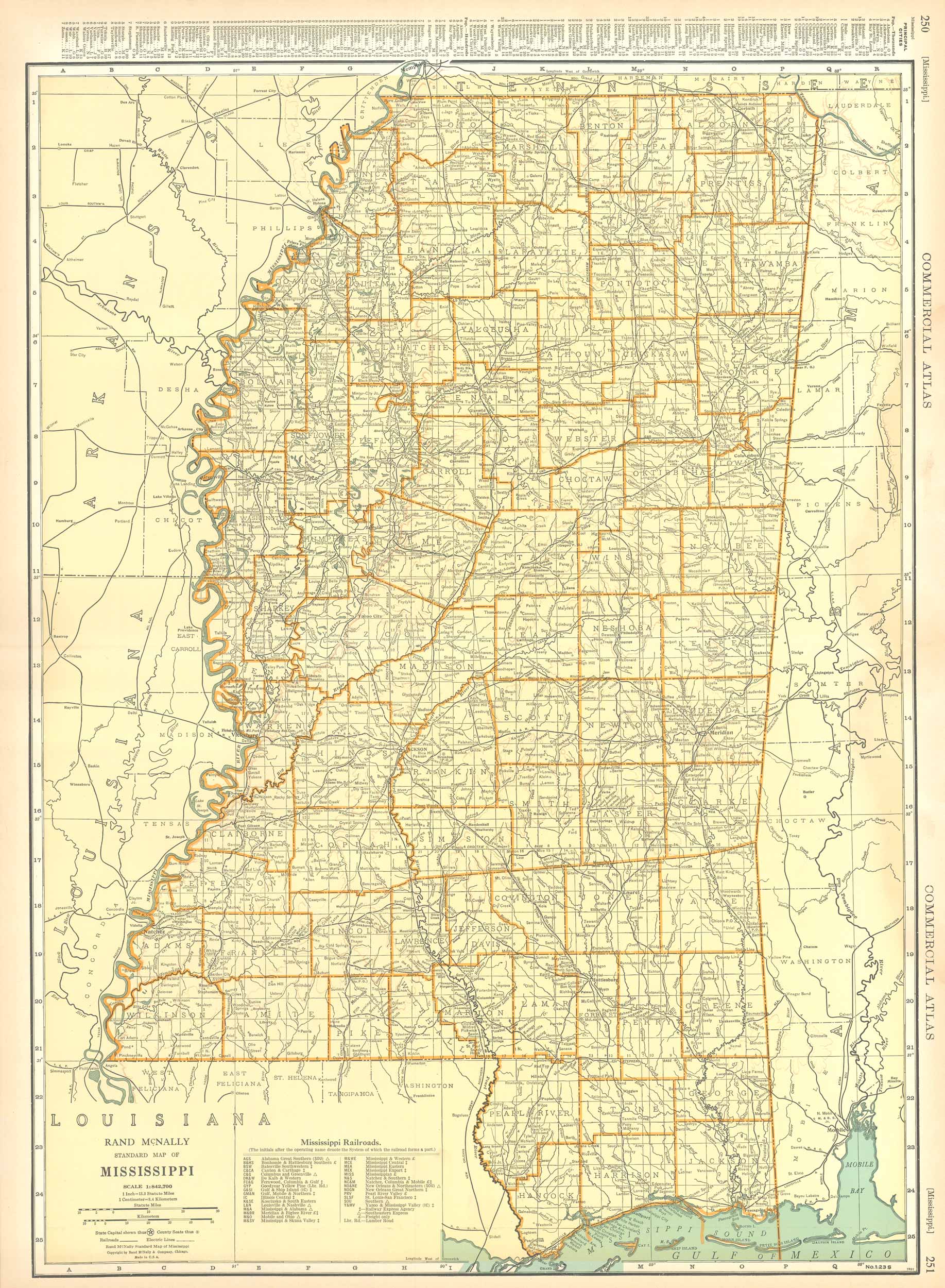Rand McNally & Company, still a major name in map publishing to this day, began as a small print shop opened in Chicago in 1856 by William H. Rand. The shop originally printed guidebooks and directories. In 1858, Rand hired Andrew McNally who was later to become a partner. Within the next few years, the shop got into the railroad business by starting to print railway tickets and schedules, a key step in the development of the company. The ticket printing led to the publishing of railway guides, and by 1872 Rand McNally and Company had the capacity to publish maps. This map of Mississippi came from Rand McNally’s Commercial Atlas. A highly successful run of atlases that lasted over a decade. These maps were primarily used by business, because of their accurate listing of railroads in operation as well as tables of statistical information. This map is unique in several ways, their large format makes an impressive display, and offers additional room where many small towns and extra details are included. Additionally a list of every railroad operating in the state in 1932 is included. All railroad routes are shown on the map. This map includes all cities and towns, lakes, rivers, and bodies of water. All topographical features are also included as well as political features such as counties and Native American Indian reservations.