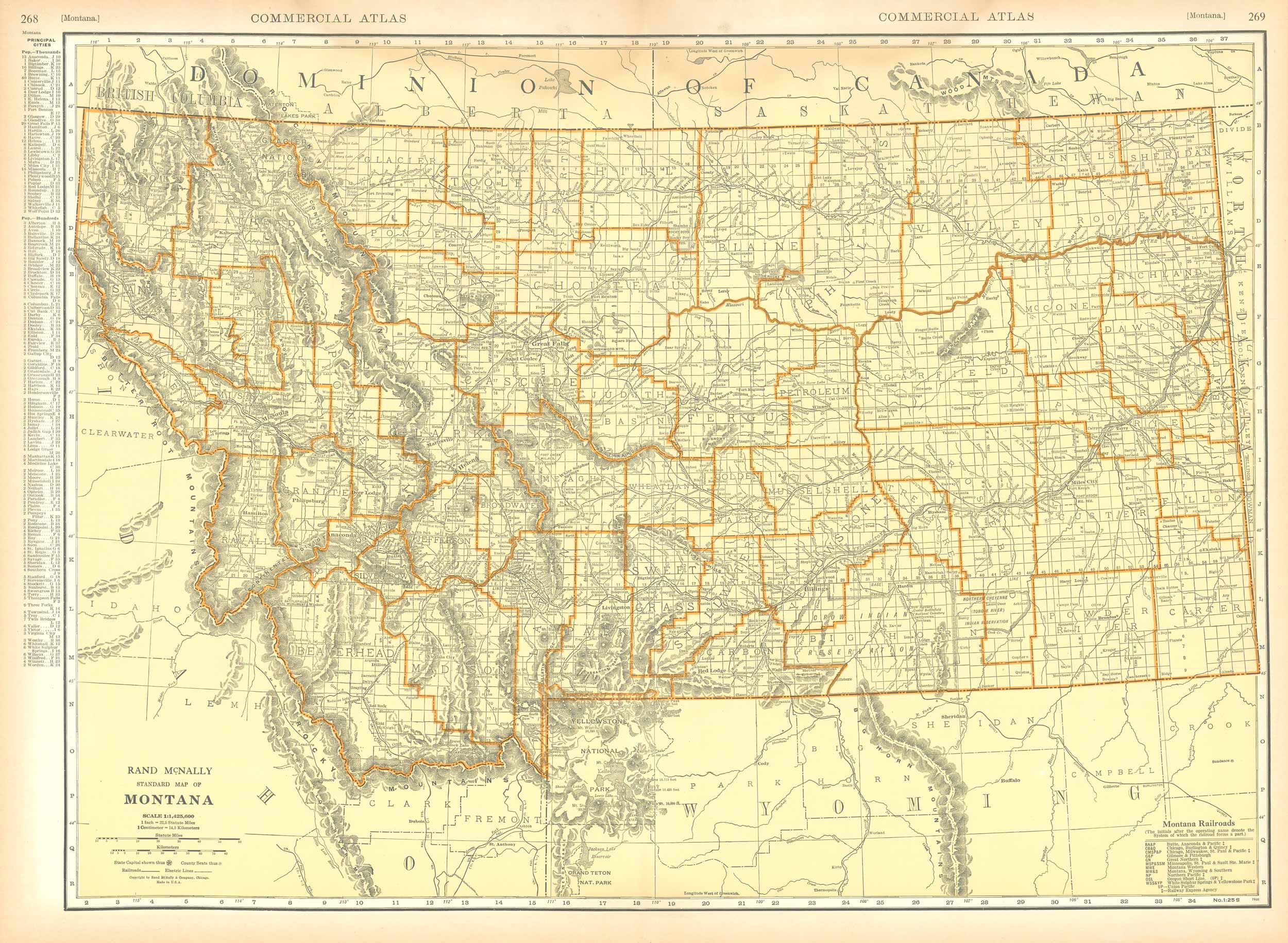 Rand McNally & Company, still a major name in map publishing to this day, began as a small print shop opened in Chicago in 1856 by William H. Rand. The shop originally printed guidebooks and directories. In 1858, Rand hired Andrew McNally who was later to become a partner. Within the next few years, the shop got into the railroad business by starting to print railway tickets and schedules, a key step in the development of the company. The ticket printing led to the publishing of railway guides, and by 1872 Rand McNally and Company had the capacity to publish maps. This map of Montana came from Rand McNallys Commercial Atlas. A highly successful run of atlases that lasted over a decade. These maps were primarily used by business, because of their accurate listing of railroads in operation as well as tables of statistical information. This map is unique in several ways, their large format makes an impressive display, and offers additional room where many small towns and extra details are included. Additionally a list of every railroad operating in the state in 1932 is included. All railroad routes are shown on the map. This map includes all cities and towns, lakes, rivers, and bodies of water. All topographical features are also included as well as political features such as counties and Native American Indian reservations.