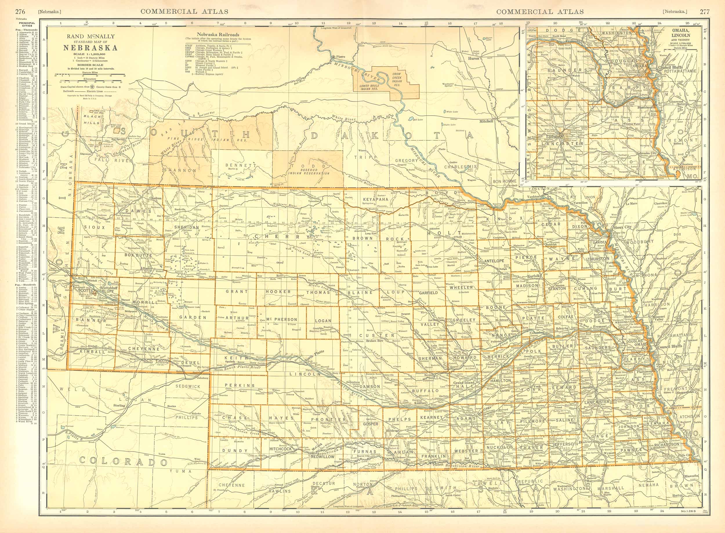 Rand McNally & Company, still a major name in map publishing to this day, began as a small print shop opened in Chicago in 1856 by William H. Rand. The shop originally printed guidebooks and directories. In 1858, Rand hired Andrew McNally who was later to become a partner. Within the next few years, the shop got into the railroad business by starting to print railway tickets and schedules, a key step in the development of the company. The ticket printing led to the publishing of railway guides, and by 1872 Rand McNally and Company had the capacity to publish maps. This map of Nebraska came from Rand McNally’s Commercial Atlas. A highly successful run of atlases that lasted over a decade. These maps were primarily used by business, because of their accurate listing of railroads in operation as well as tables of statistical information. This map is unique in several ways, their large format makes an impressive display, and offers additional room where many small towns and extra details are included. Additionally a list of every railroad operating in the state in 1932 is included. All railroad routes are shown on the map. This map includes all cities and towns, lakes, rivers, and bodies of water. All topographical features are also included as well as political features such as counties and Native American Indian reservations.