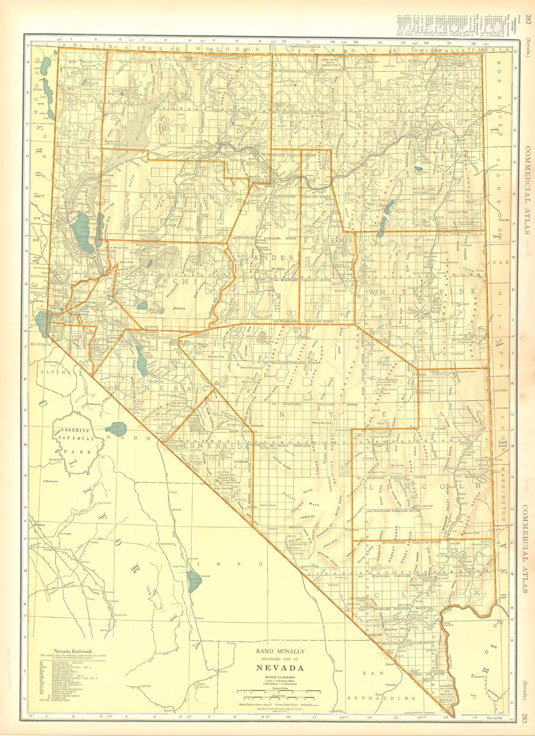 Rand McNally & Company, still a major name in map publishing to this day, began as a small print shop opened in Chicago in 1856 by William H. Rand. The shop originally printed guidebooks and directories. In 1858, Rand hired Andrew McNally who was later to become a partner. Within the next few years, the shop got into the railroad business by starting to print railway tickets and schedules, a key step in the development of the company. The ticket printing led to the publishing of railway guides, and by 1872 Rand McNally and Company had the capacity to publish maps. This map of Nevada came from Rand McNally’s Commercial Atlas. A highly successful run of atlases that lasted over a decade. These maps were primarily used by business, because of their accurate listing of railroads in operation as well as tables of statistical information. This map is unique in several ways, their large format makes an impressive display, and offers additional room where many small towns and extra details are included. Additionally a list of every railroad operating in the state in 1932 is included. All railroad routes are shown on the map. This map includes all cities and towns, lakes, rivers, and bodies of water. All topographical features are also included as well as political features such as counties and Native American Indian reservations.