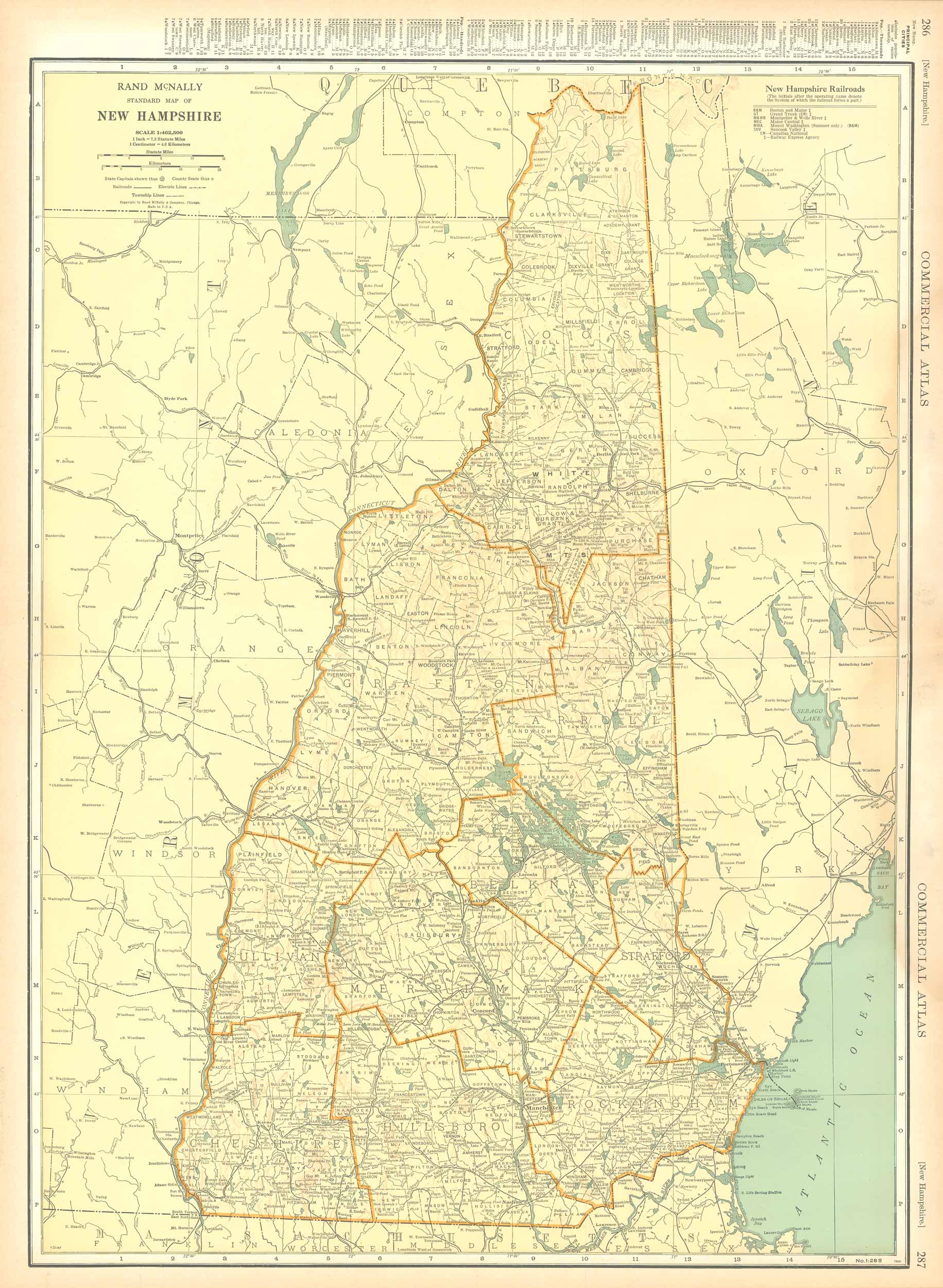 Rand McNally & Company, still a major name in map publishing to this day, began as a small print shop opened in Chicago in 1856 by William H. Rand. The shop originally printed guidebooks and directories. In 1858, Rand hired Andrew McNally who was later to become a partner. Within the next few years, the shop got into the railroad business by starting to print railway tickets and schedules, a key step in the development of the company. The ticket printing led to the publishing of railway guides, and by 1872 Rand McNally and Company had the capacity to publish maps. This map of New Hampshire came from Rand McNally’s Commercial Atlas. A highly successful run of atlases that lasted over a decade. These maps were primarily used by business, because of their accurate listing of railroads in operation as well as tables of statistical information. This map is unique in several ways, their large format makes an impressive display, and offers additional room where many small towns and extra details are included. Additionally a list of every railroad operating in the state in 1932 is included. All railroad routes are shown on the map. This map includes all cities and towns, lakes, rivers, and bodies of water. All topographical features are also included as well as political features such as counties and Native American Indian reservations.