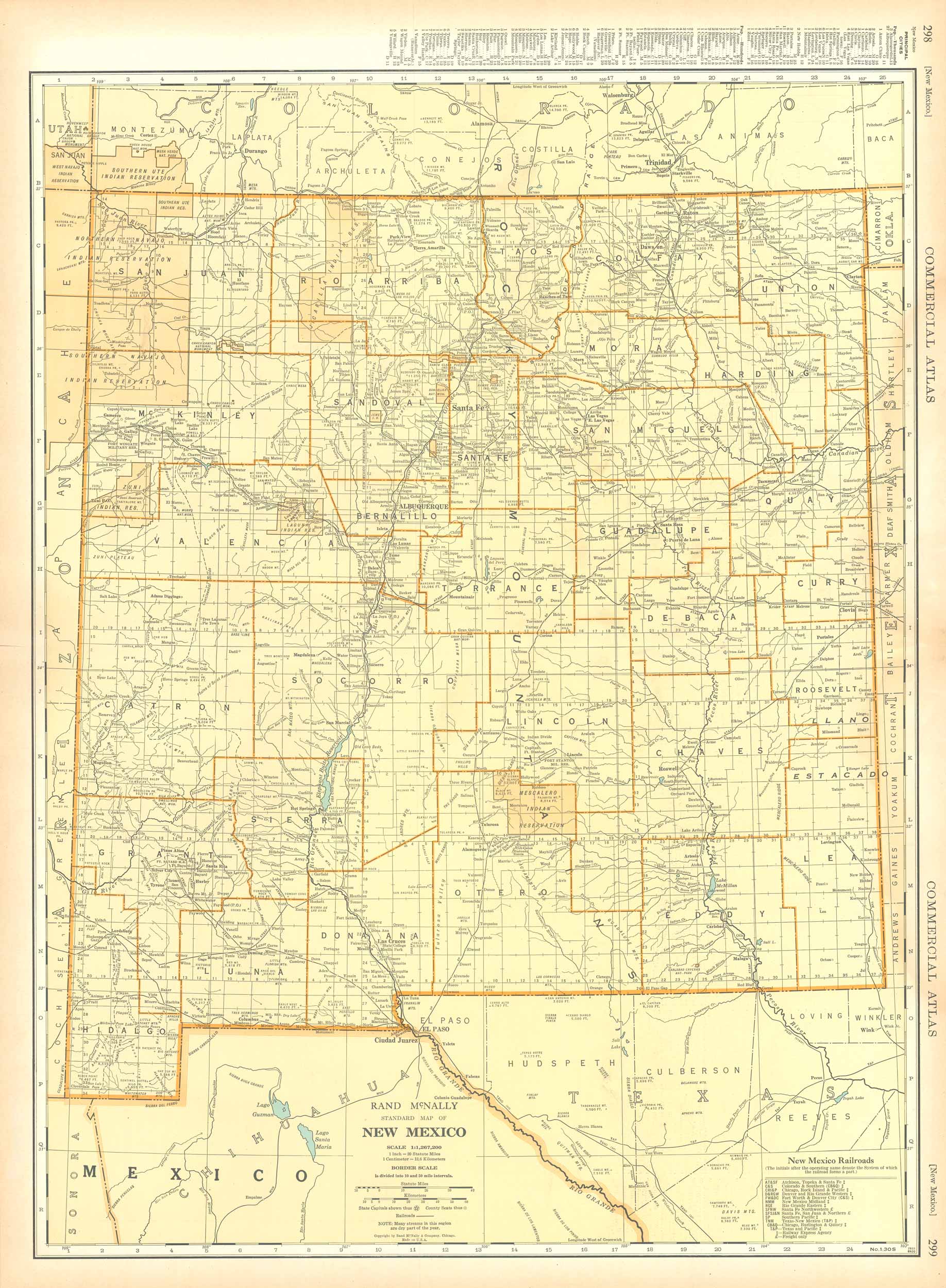 Rand McNally & Company, still a major name in map publishing to this day, began as a small print shop opened in Chicago in 1856 by William H. Rand. The shop originally printed guidebooks and directories. In 1858, Rand hired Andrew McNally who was later to become a partner. Within the next few years, the shop got into the railroad business by starting to print railway tickets and schedules, a key step in the development of the company. The ticket printing led to the publishing of railway guides, and by 1872 Rand McNally and Company had the capacity to publish maps. This map of New Mexico came from Rand McNallys Commercial Atlas. A highly successful run of atlases that lasted over a decade. These maps were primarily used by business, because of their accurate listing of railroads in operation as well as tables of statistical information. This map is unique in several ways, their large format makes an impressive display, and offers additional room where many small towns and extra details are included. Additionally a list of every railroad operating in the state in 1932 is included. All railroad routes are shown on the map. This map includes all cities and towns, lakes, rivers, and bodies of water. All topographical features are also included as well as political features such as counties and Native American Indian reservations.