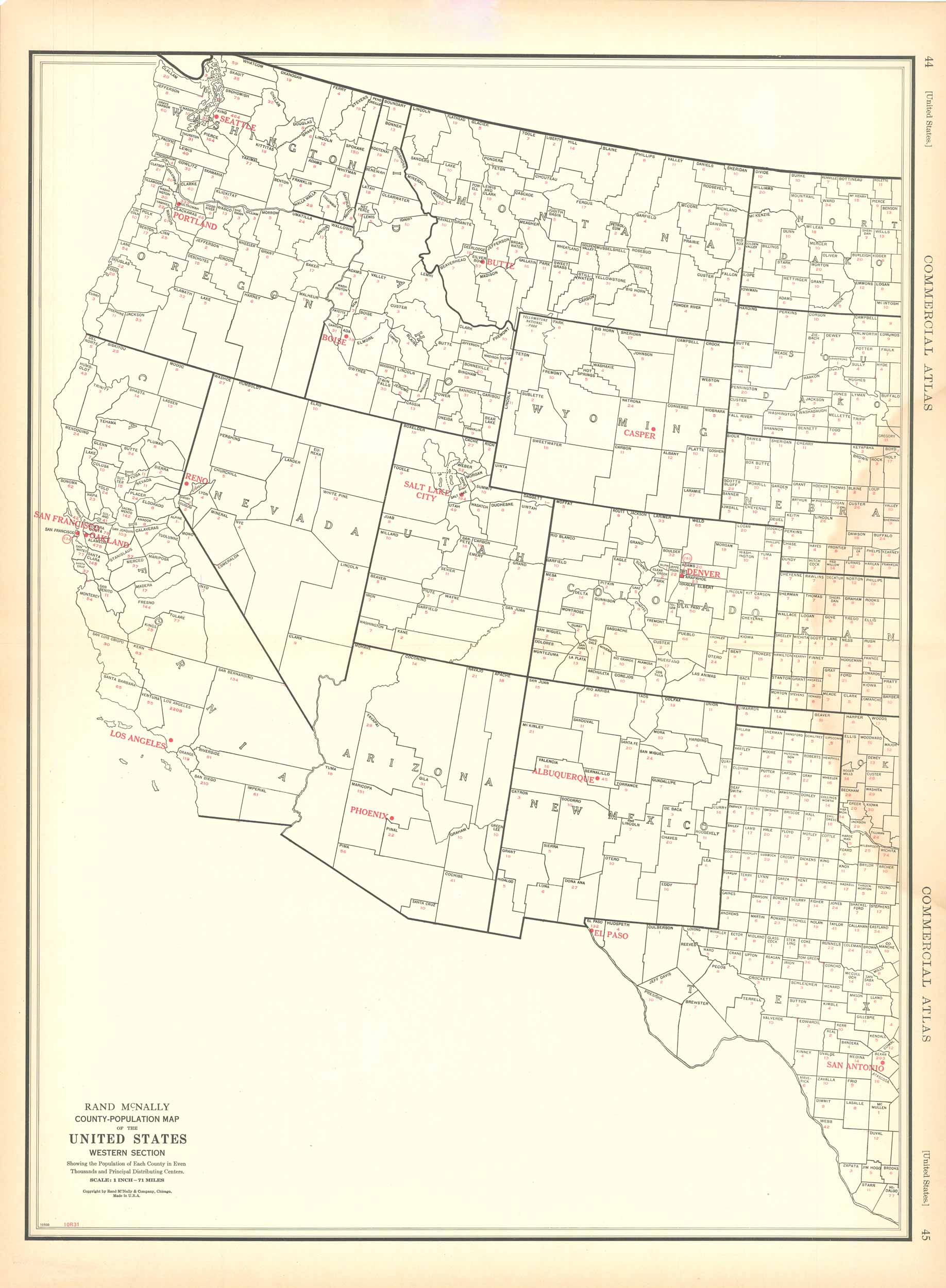 Rand McNally & Company, still a major name in map publishing to this day, began as a small print shop opened in Chicago in 1856 by William H. Rand. The shop originally printed guidebooks and directories. In 1858, Rand hired Andrew McNally who was later to become a partner. Within the next few years, the shop got into the railroad business by starting to print railway tickets and schedules, a key step in the development of the company. The ticket printing led to the publishing of railway guides, and by 1872 Rand McNally and Company had the capacity to publish maps. This map of North America, Western Population came from Rand McNally’s Commercial Atlas. A highly successful run of atlases that lasted over a decade. These maps were primarily used by business, because of their accurate listing of railroads in operation as well as tables of statistical information. This map is unique in several ways, their large format makes an impressive display, and offers additional room where many small towns and extra details are included. Additionally a list of every railroad operating in the state in 1932 is included. All railroad routes are shown on the map. This map includes all cities and towns, lakes, rivers, and bodies of water. All topographical features are also included as well as political features such as counties and Native American Indian reservations.
