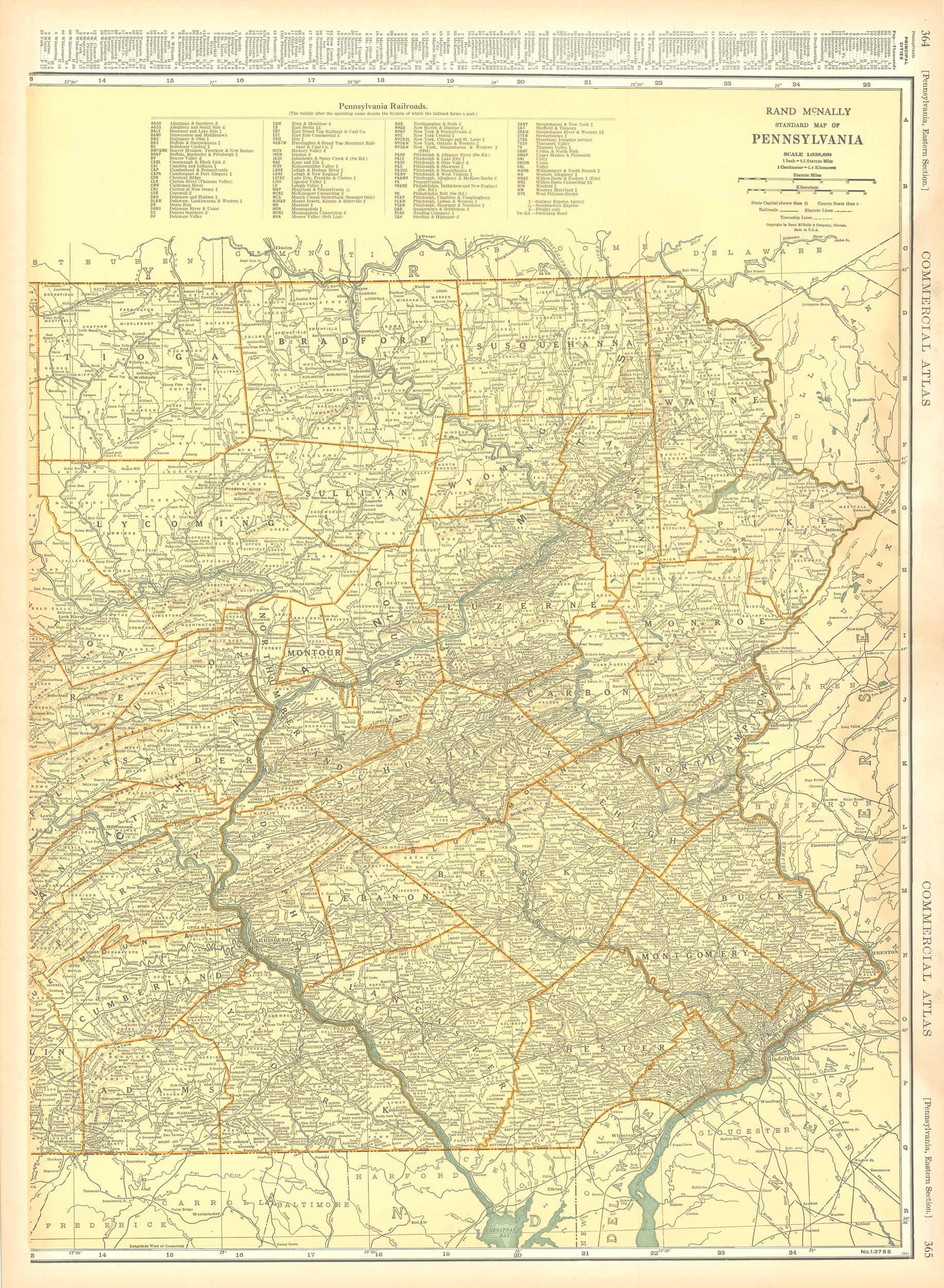 Rand McNally & Company, still a major name in map publishing to this day, began as a small print shop opened in Chicago in 1856 by William H. Rand. The shop originally printed guidebooks and directories. In 1858, Rand hired Andrew McNally who was later to become a partner. Within the next few years, the shop got into the railroad business by starting to print railway tickets and schedules, a key step in the development of the company. The ticket printing led to the publishing of railway guides, and by 1872 Rand McNally and Company had the capacity to publish maps. This map of Pennsylvania, Eastern Section came from Rand McNally’s Commercial Atlas. A highly successful run of atlases that lasted over a decade. These maps were primarily used by business, because of their accurate listing of railroads in operation as well as tables of statistical information. This map is unique in several ways, their large format makes an impressive display, and offers additional room where many small towns and extra details are included. Additionally a list of every railroad operating in the state in 1932 is included. All railroad routes are shown on the map. This map includes all cities and towns, lakes, rivers, and bodies of water. All topographical features are also included as well as political features such as counties and Native American Indian reservations.