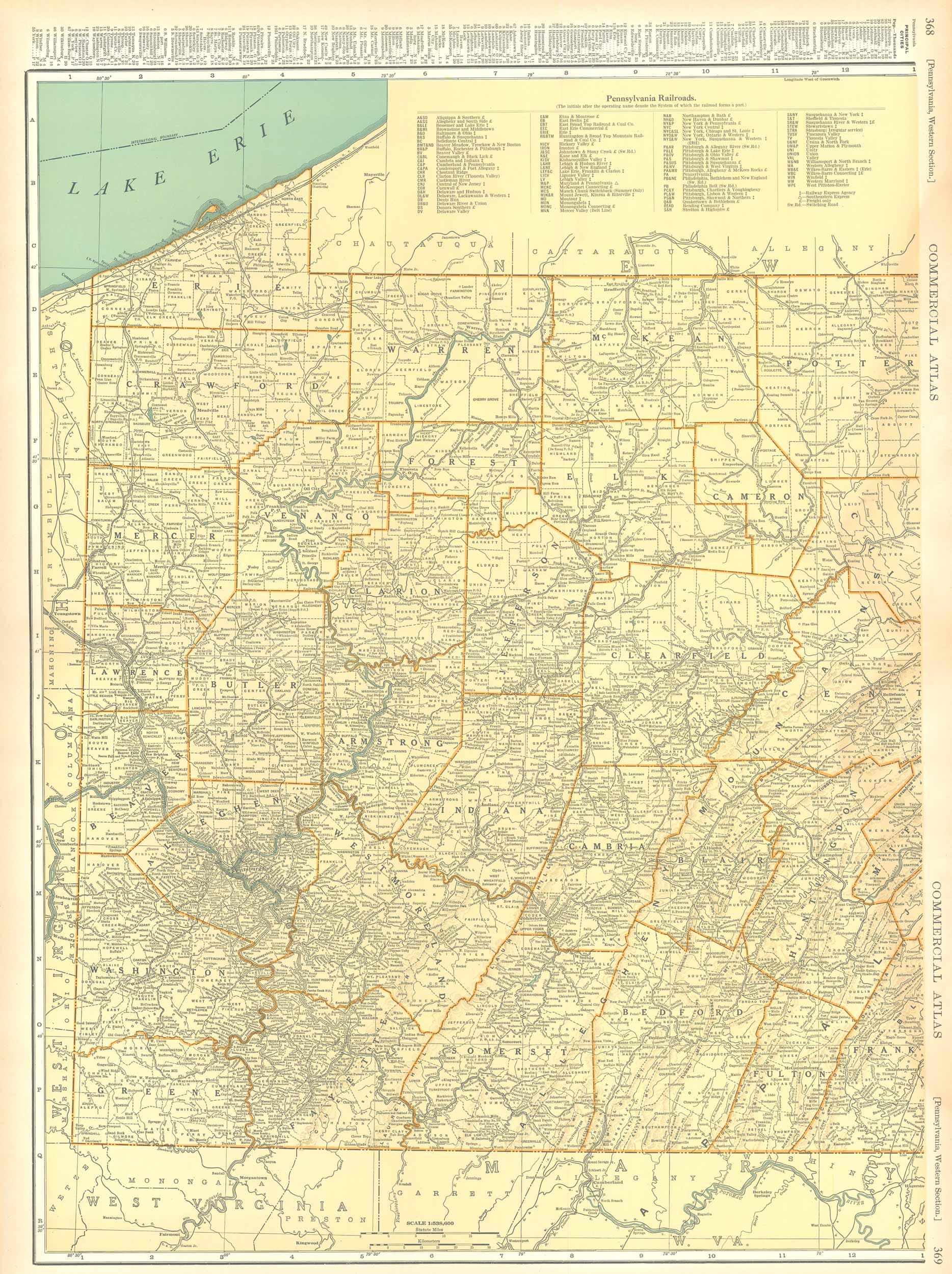 Rand McNally & Company, still a major name in map publishing to this day, began as a small print shop opened in Chicago in 1856 by William H. Rand. The shop originally printed guidebooks and directories. In 1858, Rand hired Andrew McNally who was later to become a partner. Within the next few years, the shop got into the railroad business by starting to print railway tickets and schedules, a key step in the development of the company. The ticket printing led to the publishing of railway guides, and by 1872 Rand McNally and Company had the capacity to publish maps. This map of Pennsylvania, Western Section came from Rand McNally’s Commercial Atlas. A highly successful run of atlases that lasted over a decade. These maps were primarily used by business, because of their accurate listing of railroads in operation as well as tables of statistical information. This map is unique in several ways, their large format makes an impressive display, and offers additional room where many small towns and extra details are included. Additionally a list of every railroad operating in the state in 1932 is included. All railroad routes are shown on the map. This map includes all cities and towns, lakes, rivers, and bodies of water. All topographical features are also included as well as political features such as counties and Native American Indian reservations.