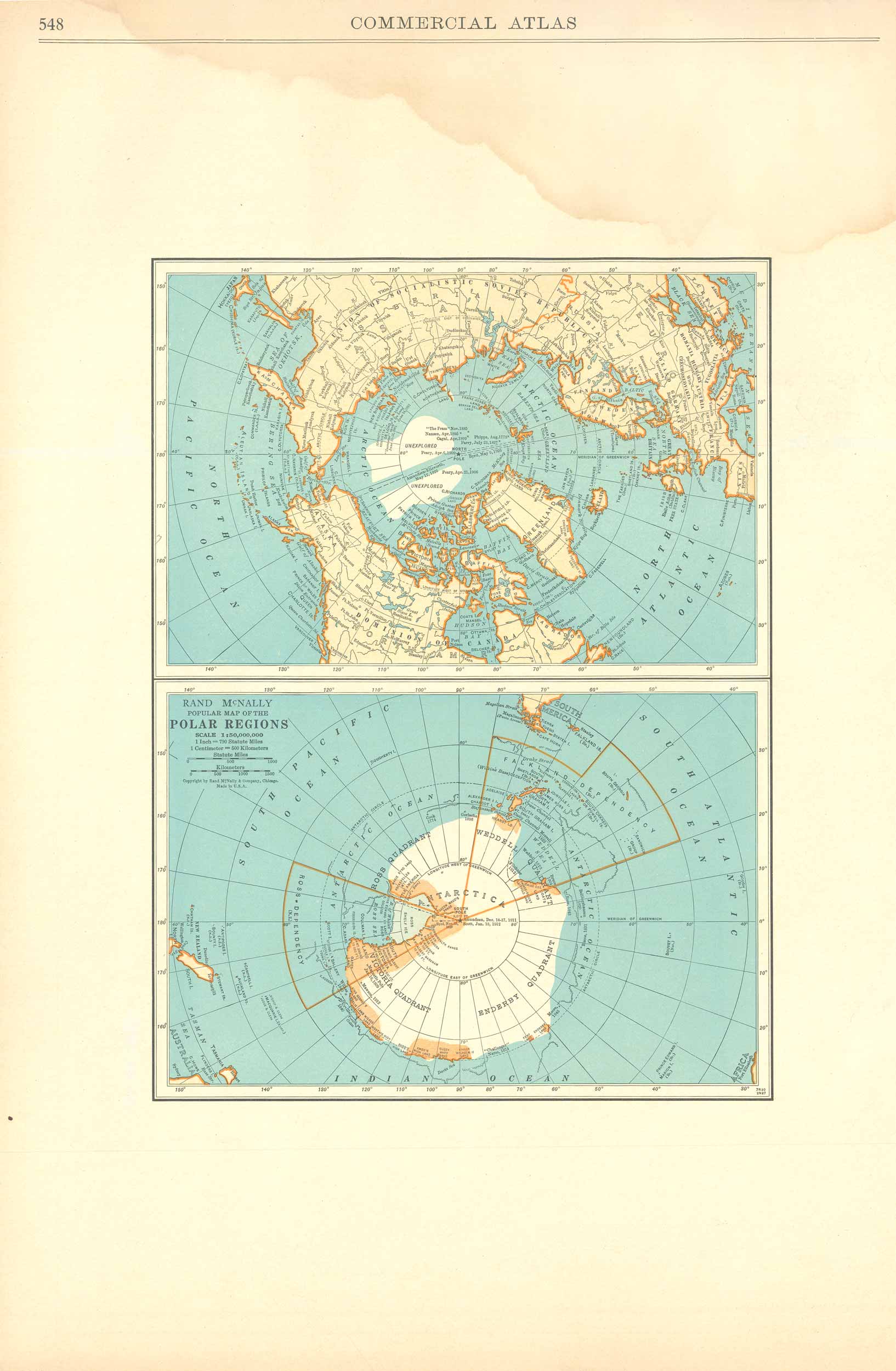 Rand McNally & Company, still a major name in map publishing to this day, began as a small print shop opened in Chicago in 1856 by William H. Rand. The shop originally printed guidebooks and directories. In 1858, Rand hired Andrew McNally who was later to become a partner. Within the next few years, the shop got into the railroad business by starting to print railway tickets and schedules, a key step in the development of the company. The ticket printing led to the publishing of railway guides, and by 1872 Rand McNally and Company had the capacity to publish maps. This map of Polar Regions came from Rand McNally’s Commercial Atlas. A highly successful run of atlases that lasted over a decade. These maps were primarily used by business, because of their accurate listing of railroads in operation as well as tables of statistical information.