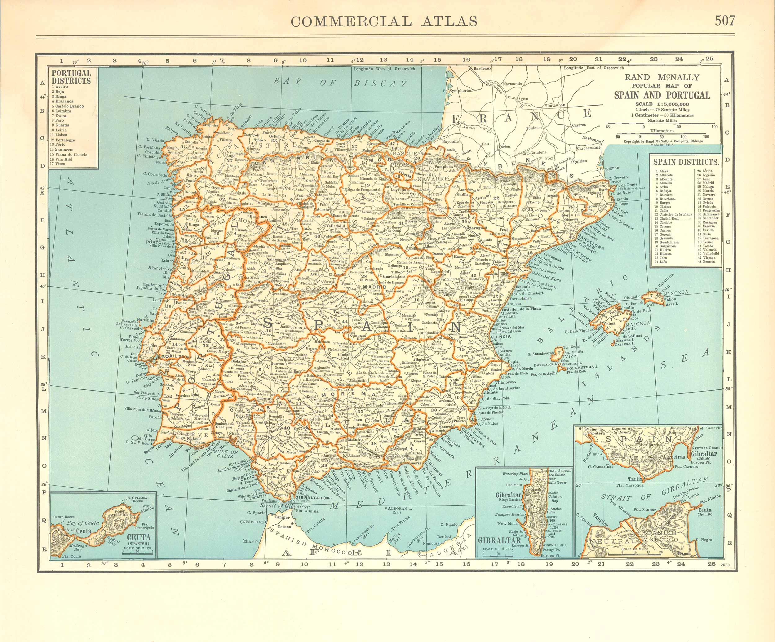Rand McNally & Company, still a major name in map publishing to this day, began as a small print shop opened in Chicago in 1856 by William H. Rand. The shop originally printed guidebooks and directories. In 1858, Rand hired Andrew McNally who was later to become a partner. Within the next few years, the shop got into the railroad business by starting to print railway tickets and schedules, a key step in the development of the company. The ticket printing led to the publishing of railway guides, and by 1872 Rand McNally and Company had the capacity to publish maps. This map of Spain and Portugal came from Rand McNally’s Commercial Atlas. A highly successful run of atlases that lasted over a decade. These maps were primarily used by business, because of their accurate listing of railroads in operation as well as tables of statistical information.