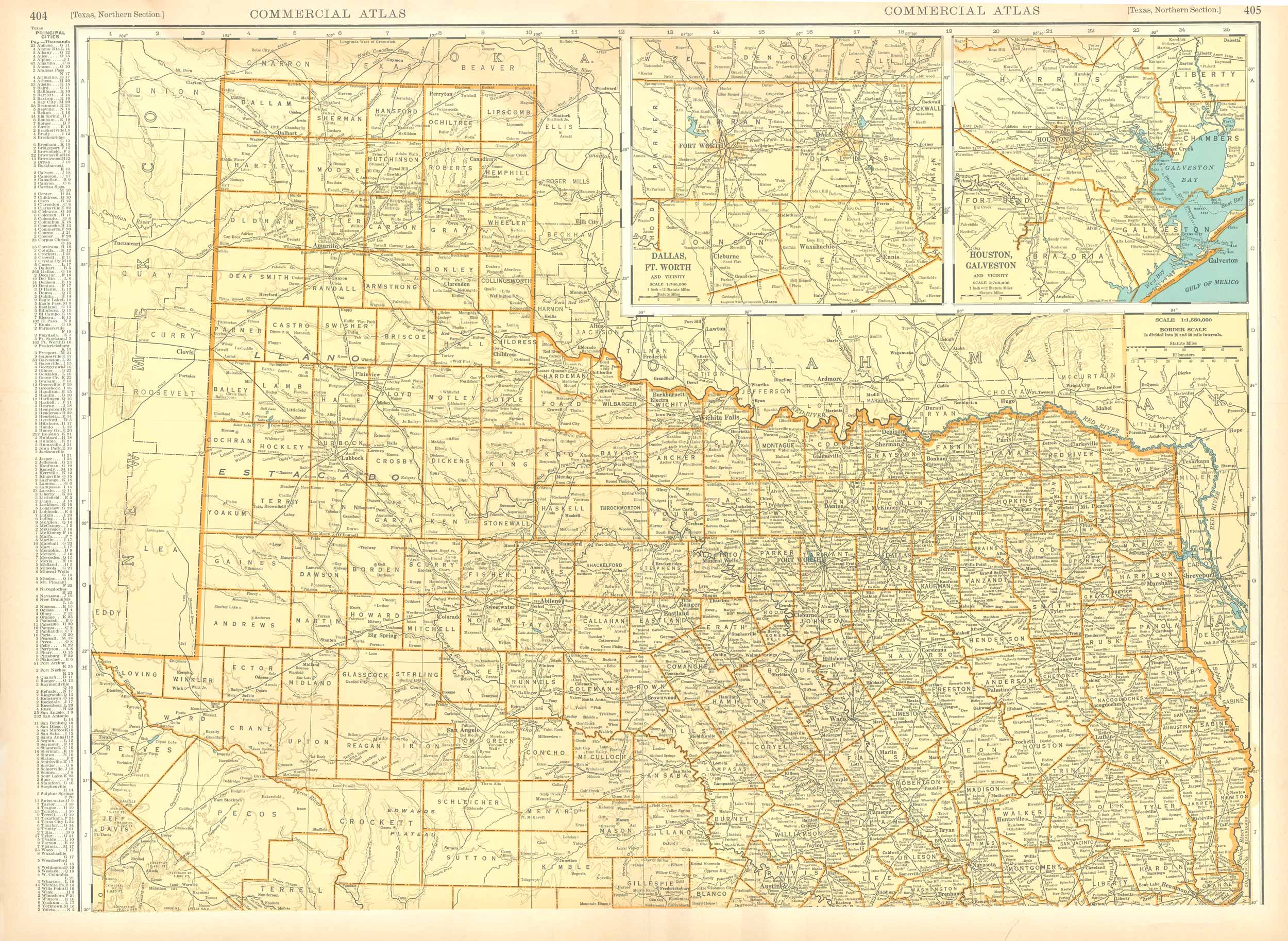 Rand McNally & Company, still a major name in map publishing to this day, began as a small print shop opened in Chicago in 1856 by William H. Rand. The shop originally printed guidebooks and directories. In 1858, Rand hired Andrew McNally who was later to become a partner. Within the next few years, the shop got into the railroad business by starting to print railway tickets and schedules, a key step in the development of the company. The ticket printing led to the publishing of railway guides, and by 1872 Rand McNally and Company had the capacity to publish maps. This map of Texas, Northern Section came from Rand McNally’s Commercial Atlas. A highly successful run of atlases that lasted over a decade. These maps were primarily used by business, because of their accurate listing of railroads in operation as well as tables of statistical information. This map is unique in several ways, their large format makes an impressive display, and offers additional room where many small towns and extra details are included. Additionally a list of every railroad operating in the state in 1932 is included. All railroad routes are shown on the map. This map includes all cities and towns, lakes, rivers, and bodies of water. All topographical features are also included as well as political features such as counties and Native American Indian reservations.