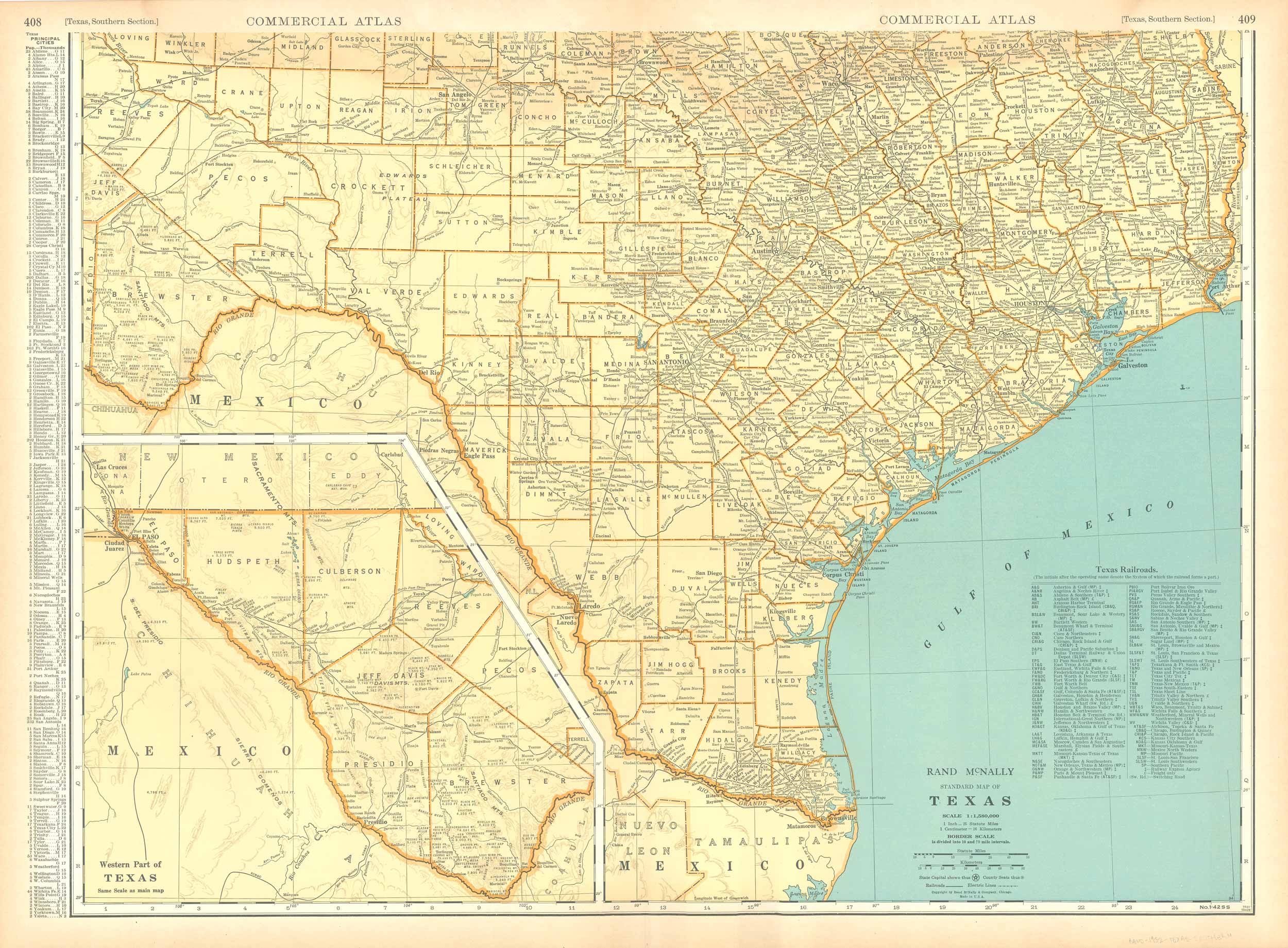 Rand McNally & Company, still a major name in map publishing to this day, began as a small print shop opened in Chicago in 1856 by William H. Rand. The shop originally printed guidebooks and directories. In 1858, Rand hired Andrew McNally who was later to become a partner. Within the next few years, the shop got into the railroad business by starting to print railway tickets and schedules, a key step in the development of the company. The ticket printing led to the publishing of railway guides, and by 1872 Rand McNally and Company had the capacity to publish maps. This map of Texas, Southern Section came from Rand McNally’s Commercial Atlas. A highly successful run of atlases that lasted over a decade. These maps were primarily used by business, because of their accurate listing of railroads in operation as well as tables of statistical information. This map is unique in several ways, their large format makes an impressive display, and offers additional room where many small towns and extra details are included. Additionally a list of every railroad operating in the state in 1932 is included. All railroad routes are shown on the map. This map includes all cities and towns, lakes, rivers, and bodies of water. All topographical features are also included as well as political features such as counties and Native American Indian reservations.