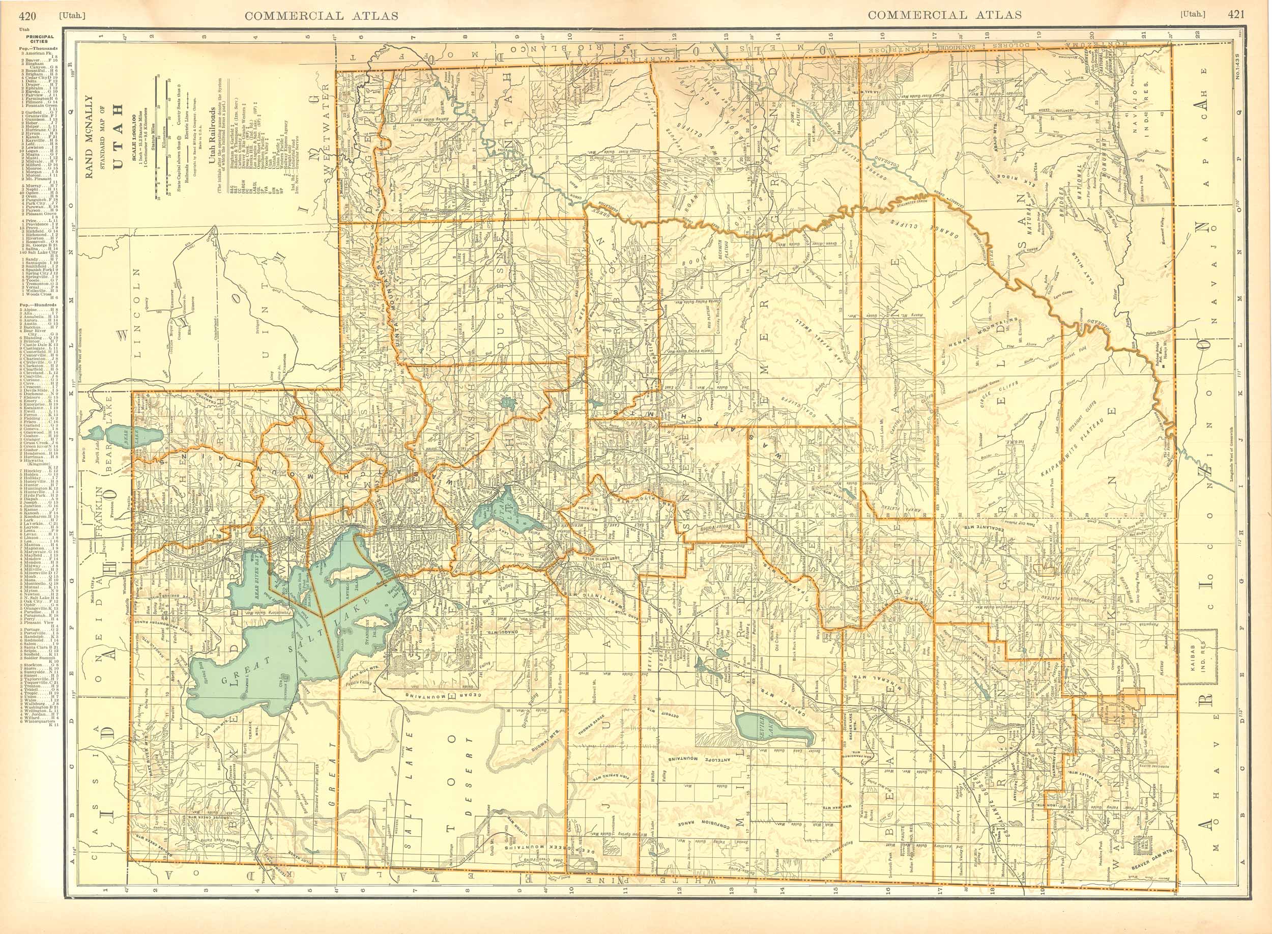 Rand McNally & Company, still a major name in map publishing to this day, began as a small print shop opened in Chicago in 1856 by William H. Rand. The shop originally printed guidebooks and directories. In 1858, Rand hired Andrew McNally who was later to become a partner. Within the next few years, the shop got into the railroad business by starting to print railway tickets and schedules, a key step in the development of the company. The ticket printing led to the publishing of railway guides, and by 1872 Rand McNally and Company had the capacity to publish maps. This map of Utah came from Rand McNally’s Commercial Atlas. A highly successful run of atlases that lasted over a decade. These maps were primarily used by business, because of their accurate listing of railroads in operation as well as tables of statistical information. This map is unique in several ways, their large format makes an impressive display, and offers additional room where many small towns and extra details are included. Additionally a list of every railroad operating in the state in 1932 is included. All railroad routes are shown on the map. This map includes all cities and towns, lakes, rivers, and bodies of water. All topographical features are also included as well as political features such as counties and Native American Indian reservations.