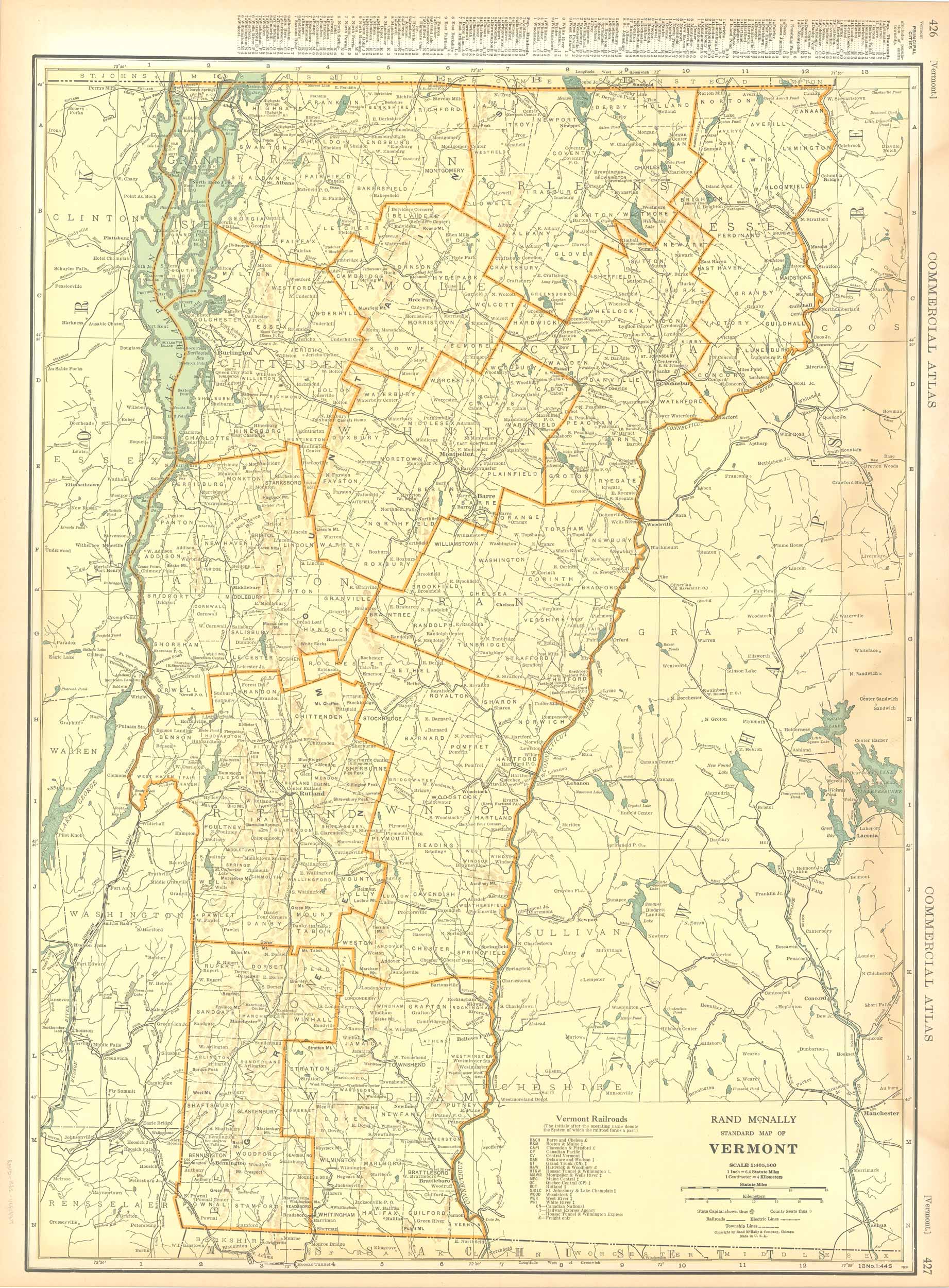 Rand McNally & Company, still a major name in map publishing to this day, began as a small print shop opened in Chicago in 1856 by William H. Rand. The shop originally printed guidebooks and directories. In 1858, Rand hired Andrew McNally who was later to become a partner. Within the next few years, the shop got into the railroad business by starting to print railway tickets and schedules, a key step in the development of the company. The ticket printing led to the publishing of railway guides, and by 1872 Rand McNally and Company had the capacity to publish maps. This map of Vermont came from Rand McNally’s Commercial Atlas. A highly successful run of atlases that lasted over a decade. These maps were primarily used by business, because of their accurate listing of railroads in operation as well as tables of statistical information. This map is unique in several ways, their large format makes an impressive display, and offers additional room where many small towns and extra details are included. Additionally a list of every railroad operating in the state in 1932 is included. All railroad routes are shown on the map. This map includes all cities and towns, lakes, rivers, and bodies of water. All topographical features are also included as well as political features such as counties and Native American Indian reservations.