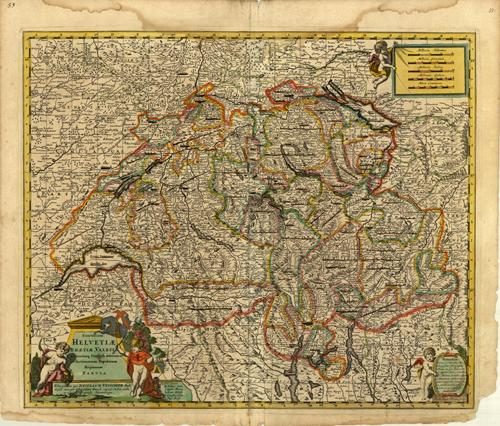 The “Exactissima Helvetiae Rhaetiae, Valesiae Caeterorumque Confoederatorum ut et Finitimorum Populorum Regionum Tabula” is a meticulously detailed map of Switzerland and its neighboring regions, crafted by the Dutch cartographer Nicolas Visscher in 1690. This map is renowned for its precision and artistic embellishments, reflecting the cartographic excellence of the period.