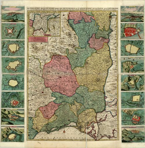 Detailed map on two sheets of southern France and the Mediterranean coast between Avignon, Montpellier and Narbonne, reaching North to Lyon. Inset map of Bresse. Intriguing map depicting views of the fortified cities of, Montpelier, Ciradelle de Monpellier, Nismes, Vzez, Lunel, Milhav, Savve, Allez, Le Pont St Esprit, Narbone, Lavcatte, Anduze, Pezenas, Sommieres, and Privas. The center of the map, is a military map, titled: “Le Théâtre de la Guerre dans les Cévennes, le Languedoc et le Pays aux Environs” which translates to “The Theater of War in the Cévennes, Languedoc, and the Surrounding Region” was created by the Dutch-French cartographer Pierre Mortier in the early 1700s, likely around 1707. The map depicts the southern regions of France—specifically the Cévennes and Languedoc—during the Camisard War, a Protestant uprising that followed the revocation of the Edict of Nantes. It offers an intricate representation of the terrain, including roads, mountain passes, towns, forests, and dioceses such as Montpellier, Nîmes, Alès, and Mende. The map was used not only for military insight but also to chart guerrilla warfare routes taken by the Camisard rebels, often referred to as the “mécontents.” This map is unique in that someone added the 2 sides of inset cities to it.