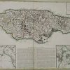 This unique and rare map of Jamaica was made by the French mapmaker Lattre in 1779. Original hand outline coloring in muted greens, reds and bright yellow highlight the geographical regions of Jamaica with two inset maps of Port Royal and Kingston and the Port of Bluefields. Topographical features are depicted with great detail given to mountains, and rivers. Place names, and transportation routes are noted and a description of Jamaica paragraph ( written in French ) is included as well. A great map, very hard to come by, Art Source International is pleased to be able to offer this island map.