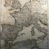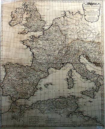 This map of Western Europe was made in 1763 by D”Anville. Identification of countries, regions, and important cities are in Latin with some sub-titles in English. Rivers, lakes, mountain ranges, major roads, and several distance scales are provided. The map is mostly black and white with countries outlined by pastel colors.