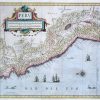 Art Source International is proud to offer rare maps from the atlas produced in 1633 by one of the dominant map-making houses of the 30s. Although it is somewhat unclear which maps were published cooperatively between Henricus Hondius and Joannes Jassonius and which were individual works, this map illustrating Peru appears to be from the French atlas “L”Appendix”. The atlas that this map is attributed to was first published in 1633 by Hondius and Jassonius and contained individual works by each map-maker, some derived from Henricus’s brother Jodocus” plates, and a number of maps by Mercator that Hondius acquired from his father -also Jodocus. The imprint of Joannes Jassonius is found on the large, exceptionally well maintained map. Beautiful hand coloring highlights rivers and the coast of Peru. The ships sailing among the monster-fish fly flags colored to represent the countries from which they hail. Many place names are identified, especially along the coast. The map is oriented as if one were sailing towards it from the east -the inland is at the top of the map. The large cartouche bearing the title also provides distance scales.