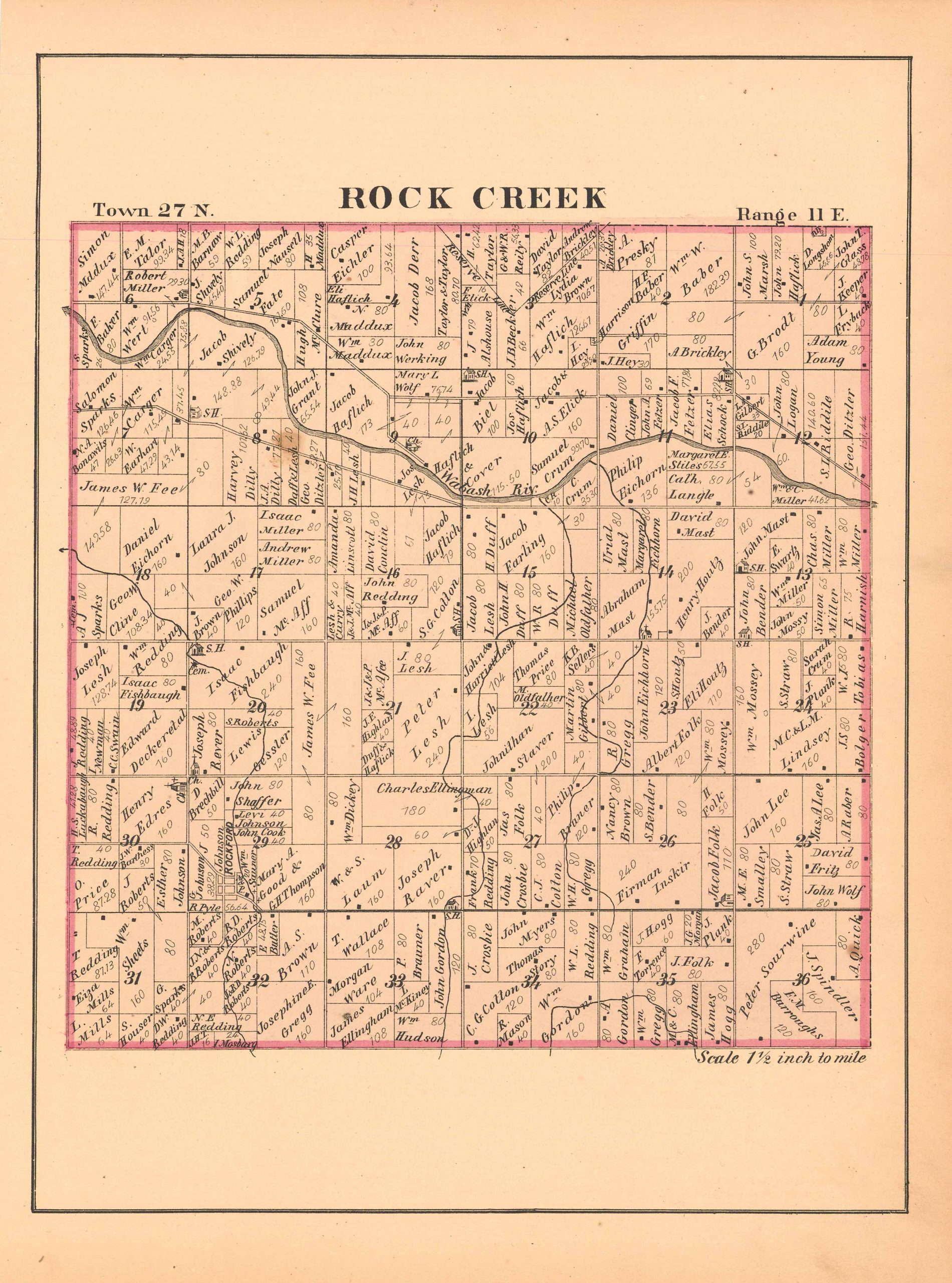 This antique map originally appeared in the “Historical Hand-Atlas” produced in 1881 by H.H. Hardesty & CO. The Atlas had nine Farm Maps, or Townships, of Wells County Indiana. Shown here is the township of Rock Creek.