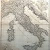 This map of Italy was made in 1764 by D”Anville. The names of provinces and important cities are in Latin with some sub-titles in English. Two insets show the environs of Rome and Urbs Septicollis at a greater scale. The majority of the map is black and white, regions are outlined with pastel color.