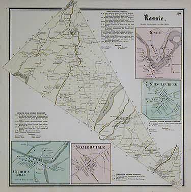 The “New Topographical Atlas of St. Lawrence County, New York” was made from the surveys of D. G. Beers, and published by Stone & Stewart in 1865. Each hand colored map illustrating a town in St. Lawrence includes abundant, historically significant details. The name of the town, streets, railroad lines, important buildings, the locations of property and the names of landowners, parks, rivers, and more relevant features are identified. This map shows Rossie with insets of the center of Rossie, Shingle Creek, Somerville and Church’s Mills, as well as lists of local businesses.