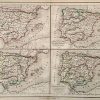 This hand colored map is from the “Atlas de Geographie”, made by Felix Delamarche in Paris, 1856. Four illustrations of Spain are shown on this well maintained French map. Pastel colors were used to distinguish regions. Other details include identification (in French) of regions, important cities, rivers, lakes, and mountain ranges.