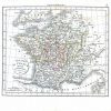 Hand-colored copper plate engraving, in French, of France, showing divisions into provinces. Shows towns, rivers, fine hatching on mountains and coastlines. Small inset map of Corsica.