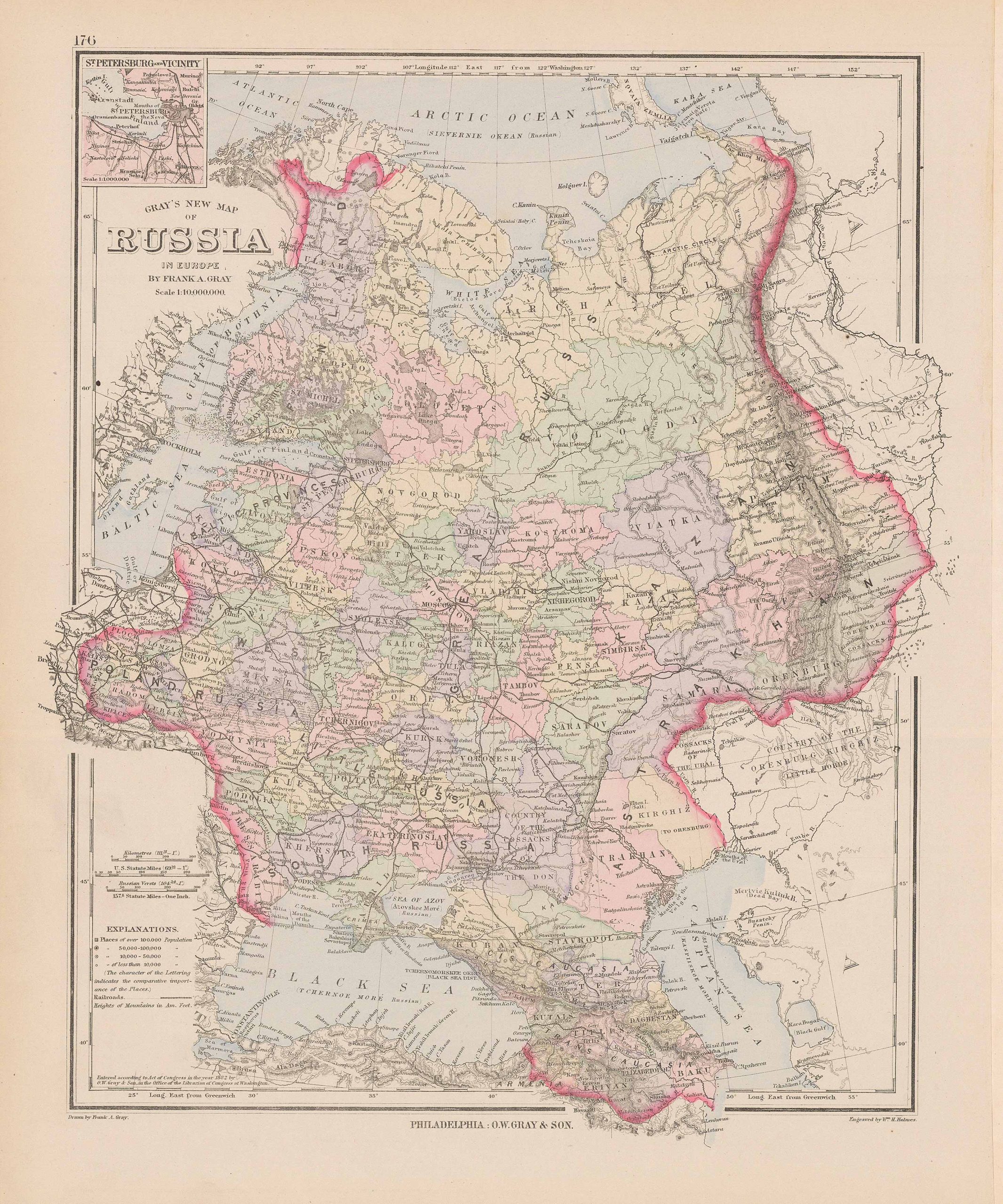 This antique map of Russia was produced by O.W. Gray as part of his “National Atlas” in 1884. Gray was involved in the production of Atlas’ from ca. 1871 – 1886. We love his maps because of the wonderful hand coloring and attention to detail.