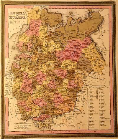 Art Source International is proud to present maps from Henry Schenk Tanner’s “New Universal Atlas”, a volume of work which in 1828 was hailed as a great advancement in the art and science of map-making. Tanner gained notoriety for this work and the one he published before it, his “New American Atlas.” Both were widely considered to be important contributions to early American cartography. This remarkable and rare map of Russia in Europe was created for the 1836 edition of the “New Universal Atlas.” The unique look is framed by a sage and pink border that complements the original hand coloring in the image of the map. Rivers, lakes, mountains ranges, towns and cities are all listed at one of the greatest degrees of accuracy for maps produced at this time. In the lower right corner of this map, a chart depicts the Governments of individual states of Russia in 1860. This map is a true american rarity!!!