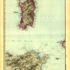 Adolf Stieler produced this exceptional map in 1896. This map of Sardinia and the northwest of Africa is highlighted with beautiful pastel colors. Maps produced by Stieler are known for their exceptional lithography and details include the names of regions and many cities, rivers, lakes, mountains, canals, railroads and other travel routes.