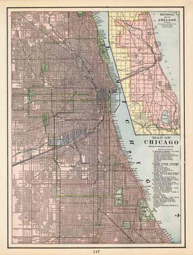 This colorful map came from Crams 1898 Universal Atlas – Geographical, Astronomical and Historical. In 1869 the George F. Cram Company was born and the Cram name quickly became synonymous with accuracy and innovation. This map of Chicago shows the primary streets, rivers, railroads, parks, and common areas.