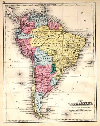 This hand colored was made for “Mitchells Modern Atlas-drawn and engraved expressly to illustrate Mitchell’s New School Geography” published in 1873.South America is illustrated on this map. Countries are distinguished by color. The names of countries, important cities, mountains, and rivers are provided.