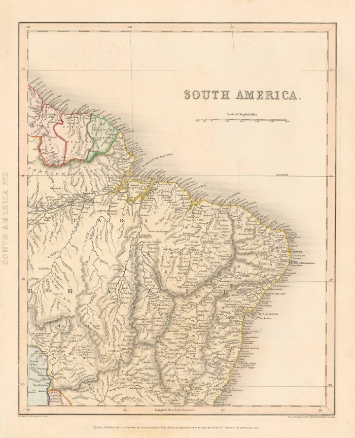 We are proud to offer this very rare map of South America (Northeast) by James Gilbert. This map was issued in 1840 as part of Gilbert’s Modern Atlas of the Earth. In our over 40 years in the antique map business, it is difficult to remember any finer maps than these. The coloring is exquisite, the engraving is exceptional, and the paper quality is extraordinary.