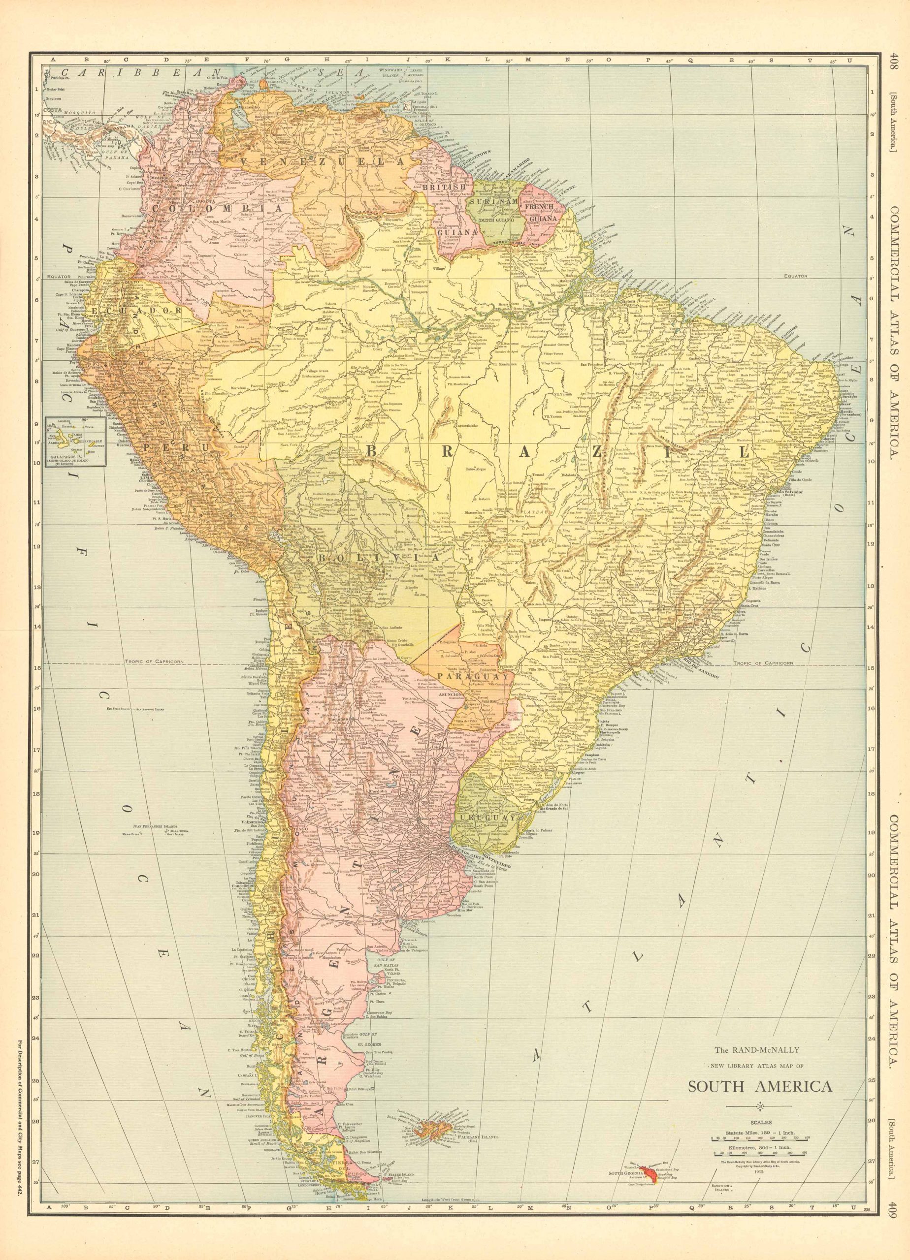 This map of South America was produced by Rand McNally and Co. as part of its Commercial Atlas of America. These maps are some of our favorite maps because of the large size of each map sheet (25.5”x20.5”). The detail shown on each map is exceptional because of the map size. These maps were intended to be used by business for shipping and other uses. Roads, railroads, rivers, and buildings are clearly shown. There is more detail on these maps than any others during this time period.