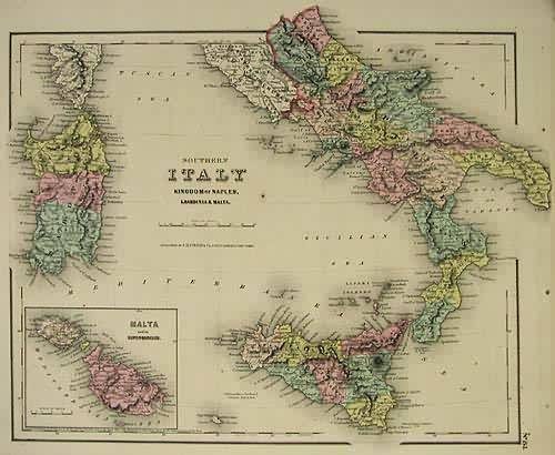 Art Source International is proud to offer this map from the 1857 edition of “Coltons General Atlas.” Colton atlases, especially those from the late 1850’s, have become increasingly rare. The “General Atlas” was the first single edition atlas published by the Colton brothers succeeding the expensive two volume “Atlas of the World.” The Colton firm refused to compromise quality, choosing to compete for sales in the finer quality international market rather than the inexpensive domestic one. Because of this, all maps were engraved by steel plates rather than by wax engraving which was the most common method used at this time. This map of Southern Italy is very detailed. It shows lakes and rivers, mountains, regions and or provinces, railroads, wagon trails, cities and towns, and many other details. Muted pastel hand coloring in pink, blue, green, and yellow. Also shown an inset map of Malta and its dependencies.