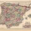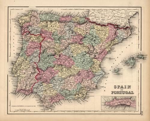 Art Source International is proud to offer this map from the 1857 edition of Coltons General Atlas. Colton atlases, especially those from the late 1850’s, have become increasingly rare. The General Atlas was the first single edition atlas published by the Colton brothers succeeding the expensive two volume Atlas of the World. The Colton firm refused to compromise quality, choosing to compete for sales in the finer quality international market rather than the cheap domestic one. Because of this, all maps were engraved by steel plates rather than by wax engraving which was the most common method used at this time. This map of Spain and Portugal is very detailed. It shows lakes and rivers, mountains, regions and or provinces, railroads, wagon trails, cities and towns, and many other details. Muted pastel hand coloring in pink, blue, green, and yellow. Includes an inset map of Gibraltar.