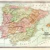 This detailed map of Spain and Portugal was printed in the “People’s Family Atlas of the World,” published in 1885. This map, which shows a great deal of topographical information, including lakes, rivers and mountains, shows the countries colored in muted pastel colors. Railroad lines are also shown.