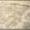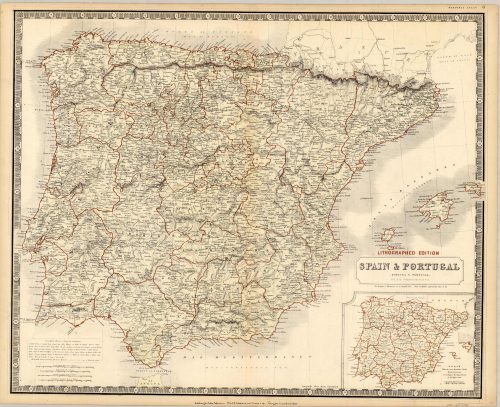This hand colored map was made by Alexander Keith Johnston for “The National Atlas of Historical, Commercial, and Political Geography”. This very rare lithographed edition was printed in Edinburgh in 1849. Spain and Portugal are illustrated on this map. An inset shows Spain divided by provinces. The boarders of regions are distinguished by dark color, while countries are colored pastel yellow. Other details include the names of regions and important cities, and illustrations of mountains, lakes, rivers, and major roads. A list of frequently used words translated into english is provided.