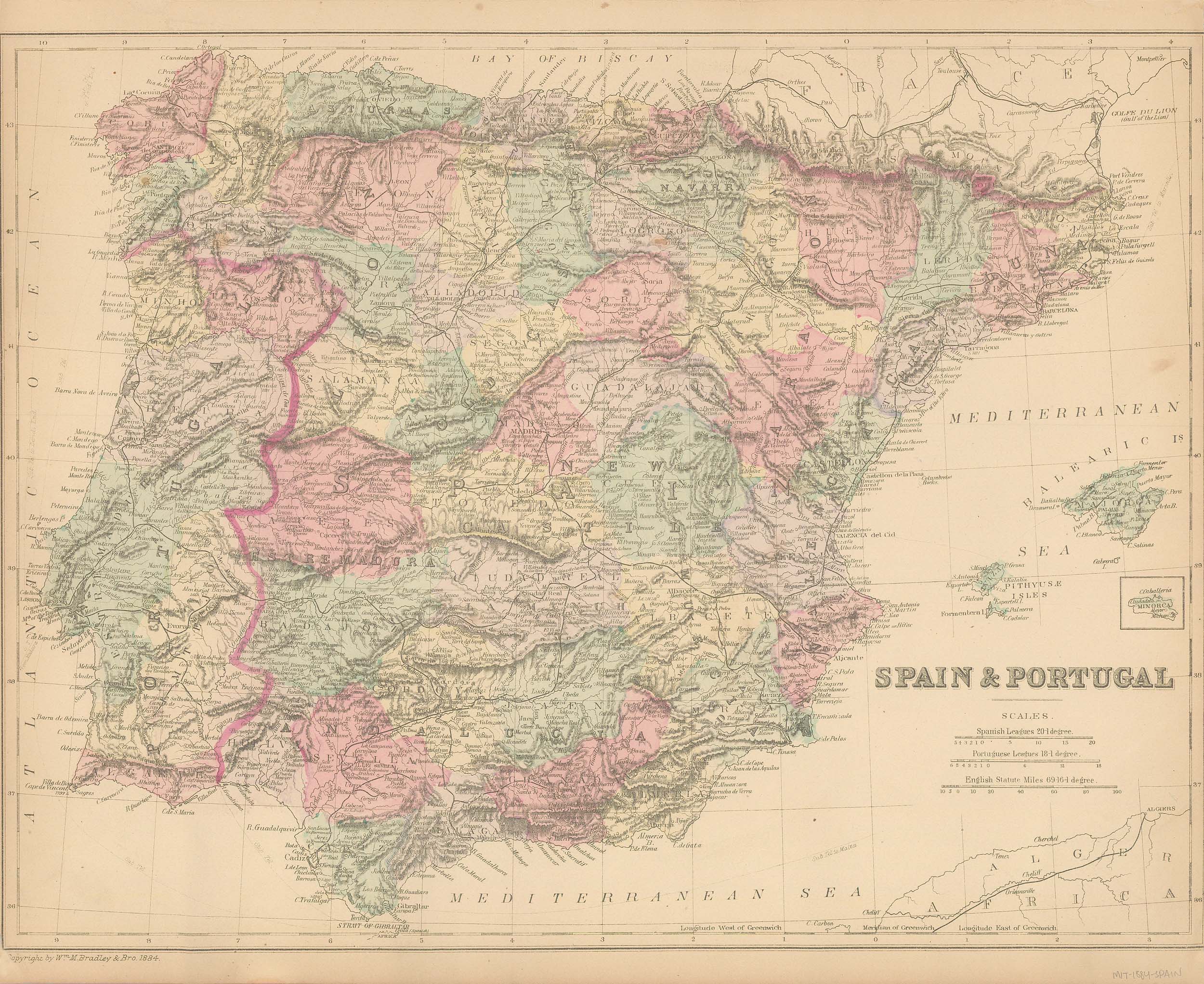 This map was made by S. Augustus Mitchell for “Mitchell’s New General Atlas” published in 1884, by WM. M. Bradley & Co. The well maintained maps in this atlas feature Mitchell’s characteristic pastel coloring and abundant geographical features. Details include the names of countries, regions, cities, towns, transportation routes, rivers, lakes, and mountain ranges. Regions are distinguished by color. These 1884 maps offer a fascinating perspective of areas that have since undergone significant growth and change, in addition to their value as great examples of Mitchell’s work.