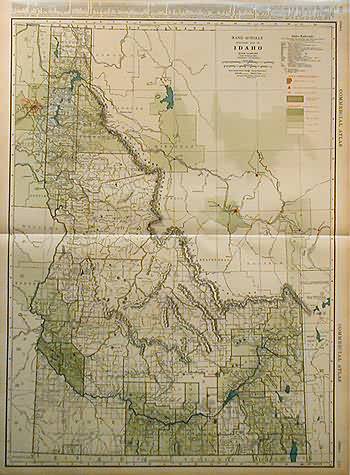 The 1936, sixty-seventh edition of the “Rand McNally Commercial Atlas and Marketing Guide” is unique in its inclusion of informative details concerning population sizes, district uses, the size of counties, and railroad routes. The names and populations of principal cities are listed beside the map. Each map is brightly colored; predominantly in green and tan with blue oceans, lakes and rivers, and brown coloring of high density metropolitan areas. Idaho is illustrated on this large, double page map. The names of states, counties, important towns, lakes, rivers and mountain ranges are labeled. A list of state railroad lines is also provided on the map.