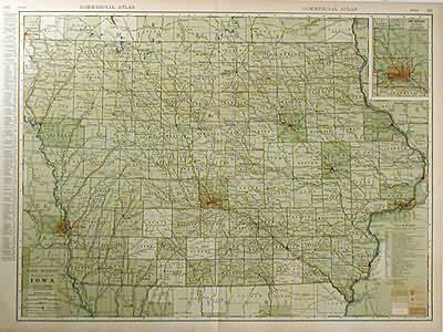 The 1936, sixty-seventh edition of the “Rand McNally Commercial Atlas and Marketing Guide” is unique in its inclusion of informative details concerning population sizes, district uses, the size of counties, and railroad routes. The names and populations of principal cities are listed beside the map. Each map is brightly colored; predominantly in green and tan with blue oceans, lakes and rivers, and brown coloring of high density metropolitan areas. Iowa is illustrated on this large, double page map with an inset of the vicinity of Des Moines. The names of states, counties, important towns, lakes, rivers and mountain ranges are labeled. A list of state railroad lines is also provided on the map.