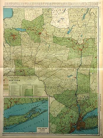 The 1936, sixty-seventh edition of the “Rand McNally Commercial Atlas and Marketing Guide” is unique in its inclusion of informative details concerning population sizes, district uses, the size of counties, and railroad routes. Cities and their populations are listed beside the map. Each map is brightly colored; predominantly in green with blue oceans, lakes and rivers, and brown coloring of high density metropolitan areas. The eastern section of New York is illustrated on this large, double page map. An inset shows the western portion of Long Island at the same scale. The names of states, counties, important towns, lakes, rivers and mountain ranges are labeled. A key lists the New York railroad lines.